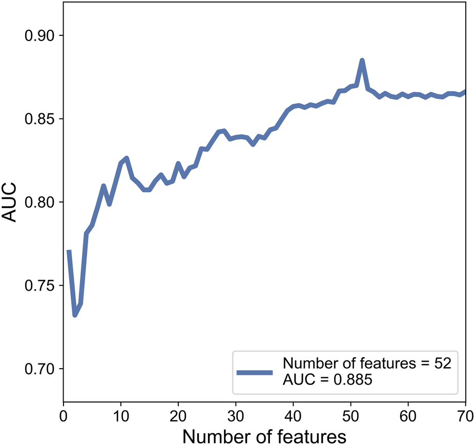 While training, each cranial US ROI was extracted 350 features based on grayscale, Wavelet_A, Wavelet_V, Wavelet_D, and Wavelet_H modes. Then 350 features were ranked by the index of SRC. Finally, SVM based C-SVC was introduced to predict WMI according to a different number of features. After the examination, we find that while using 52 features, the model performed the best with an AUC of 0.885. The change of AUC with the number of features is shown in the Figure 5.