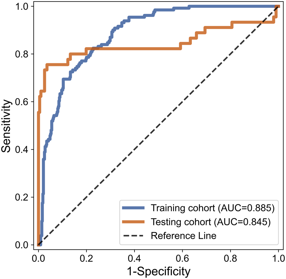 | Testing cohort | 0.845 | 87.88 | 75.56 | 96.43 | 21.16 | 0.25 |