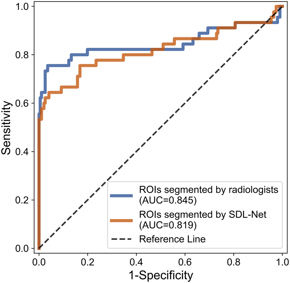 We used training cohort to train the parameters in SDL-Net, and then used testing cohort to evaluate the segmented results. As shown in Figure 7, we can see that the segmented result by SDL-Net is slightly different from the golden standard ROIs segmented by radiologists. The result is listed in Table 4. It can be observed that our method on testing cohort has an overall Dice of 0.73, an accuracy of 0.80, and an IoU of 0.72.