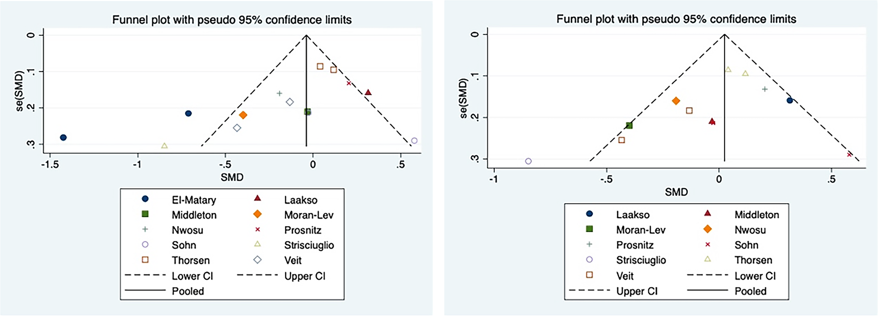Funnel plot including (left) and excluding (right) El Matary 2011. In meta-analysis, publication bias assessment mainly depends on the Egger test. It is generally believed that there is publication bias if p < 0.05. In the funnel chart, it was found that one study, El Matary 2011, was far outside the funnel chart and affected the final Egger’s test results (Figure 1 left), and the Egger’s test results we used, P = 0.037, indicated that there was significant publication bias. After removing El Matary 2011's study, the new Egger's test was conducted on the basis of the remaining 12 studies, P = 0.164, indicating no significant publication bias (Figure 1 right).
