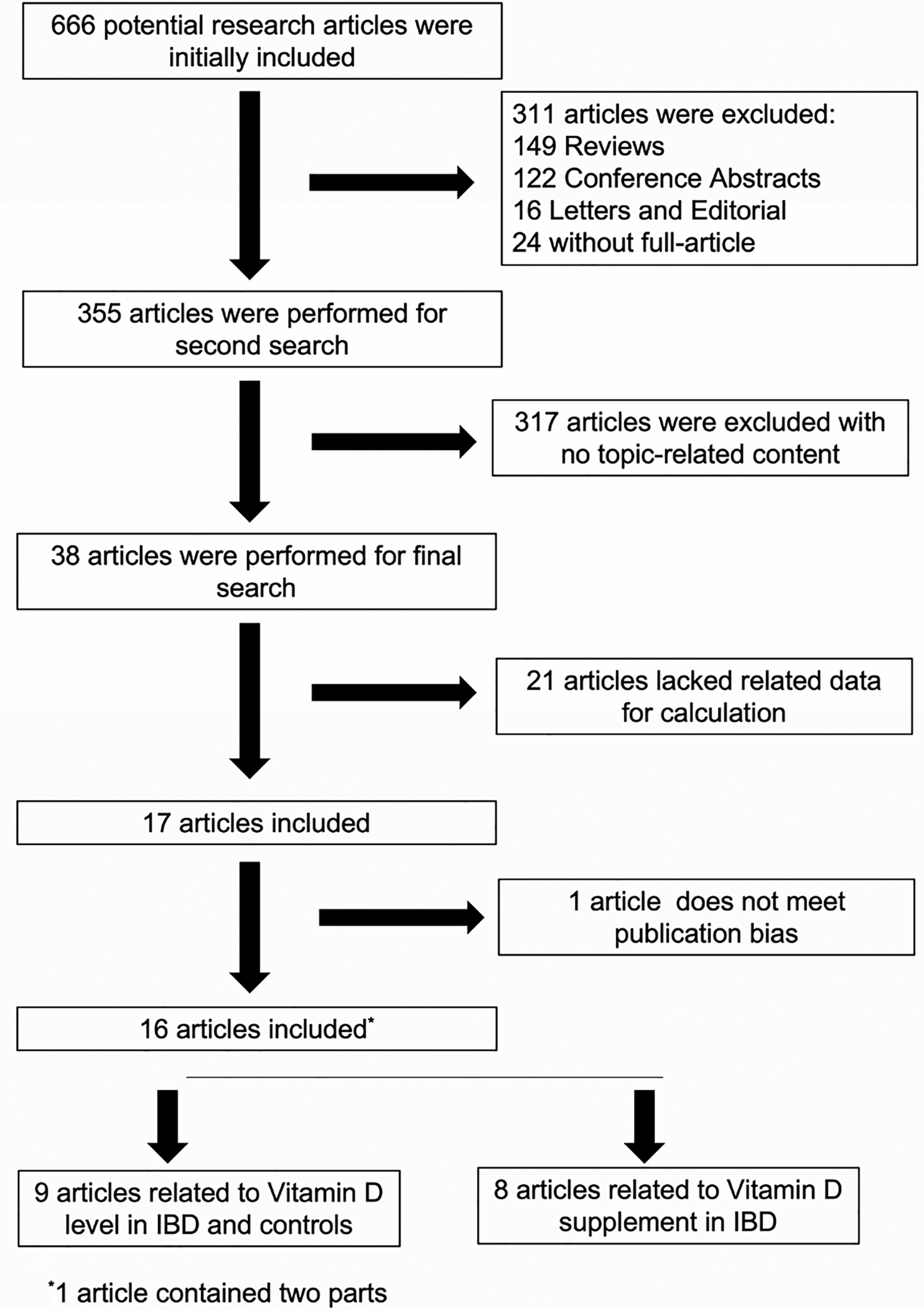 Data were extracted to numbers (Apple Distribution International, USA) for effective statistical analysis. The following data were obtained from the included studies: basic characteristics, including author, published year, country, detection method of 25(OH)D and diagnostic criteria of IBD; 25(OH)D levels [mean ± standard deviation (SD)] of IBD and controls; number of individuals with IBD and controls; IBD patients in remission and C-reactive protein (CRP) changes. The criteria for remission of IBD patients were serum levels of 25-hydroxyvitamin D increased, all relevant symptoms improved, inflammatory markers were not changed, and there were no adverse events such as overdose. Finally, all data were double-checked by two authors.