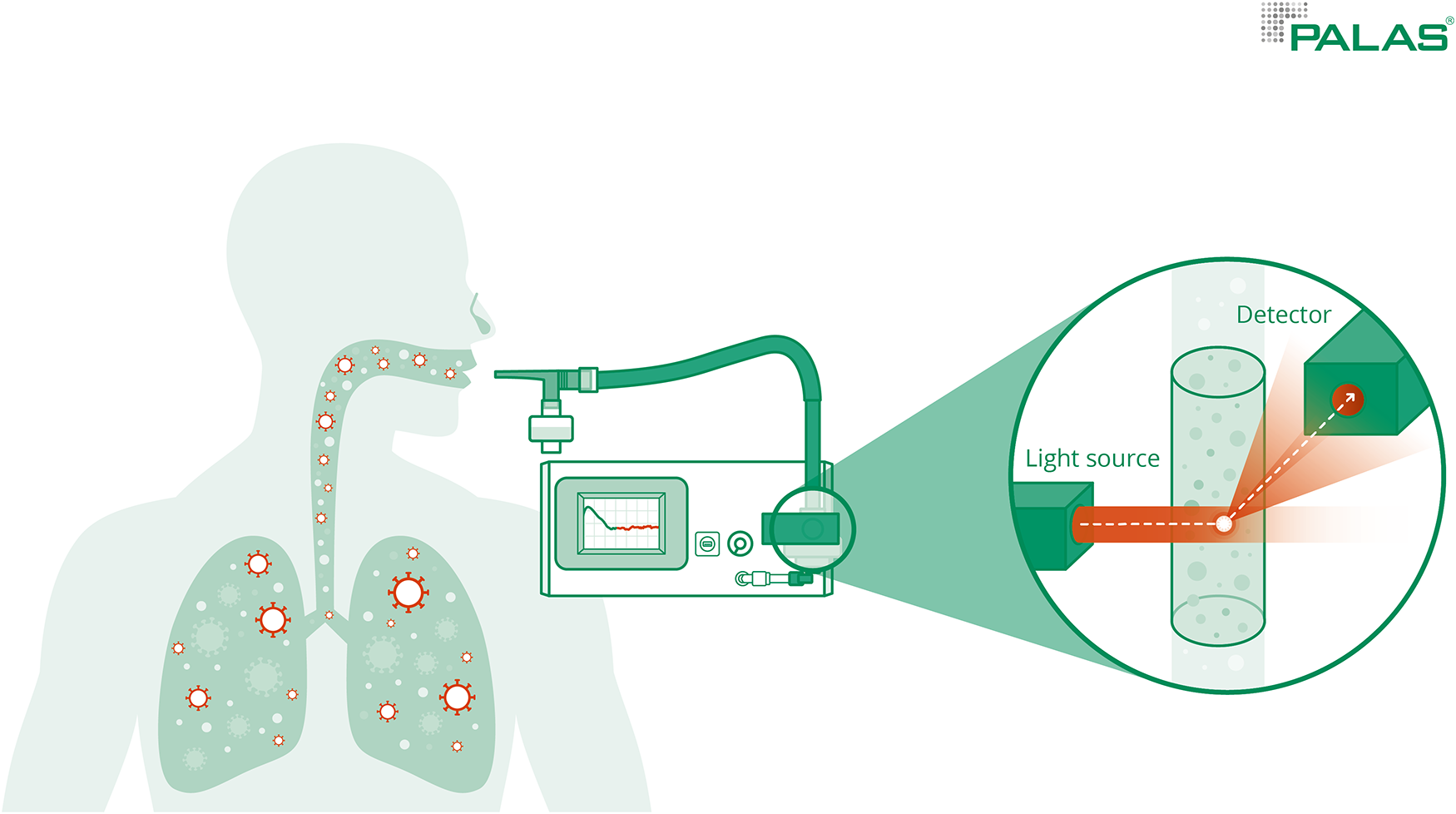 Measurements of the exhaled particle concentrations and size distribution were performed using the Resp-Aer-Meter (Palas GmbH, Karlsruhe, Germany). For this purpose, the principle of optical light scattering by means of a white light LED sensor of the Fidas® system was used. With this measuring method, exhaled particles between 145 nm and 10 µm could be detected with high resolution. In the aerosol sensor, a polychromatic light source creates a precisely defined optical measurement volume. Scattered light pulses are generated by the particles when they pass the optical light source. The particle number and size are determined by the number and intensity of the scattered light pulses. The temperature and relative humidity in the exhaled air were also measured and considered. An integrated heating element prevented condensation and allowed larger droplets to evaporate before they reached the sensor (40).