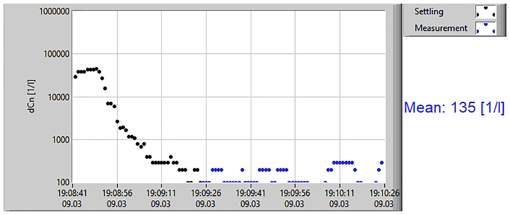 Prior to each measurement, a leak test was performed to ensure that the breathing set was fixed to the Resp-Aer-Meter without leakage. During the first minute of breathing, the washout phase took place. During this phase, environmental aerosol particles that were present in the lungs were washed out. This caused a rapid decrease in the particle concentration in the exhaled air. After a few breaths, the concentration did not further decline, and only the particles produced in the lungs were measured. The subsequent measurement phase lasted approximately 60–90 s. The results of the measurement were immediately available for documentation and evaluation. In addition to the mean value of the exhaled particle count/liter, the direct evaluation included a graphical chart of the measurement course and the aerosol particle size distribution (Figure 2).