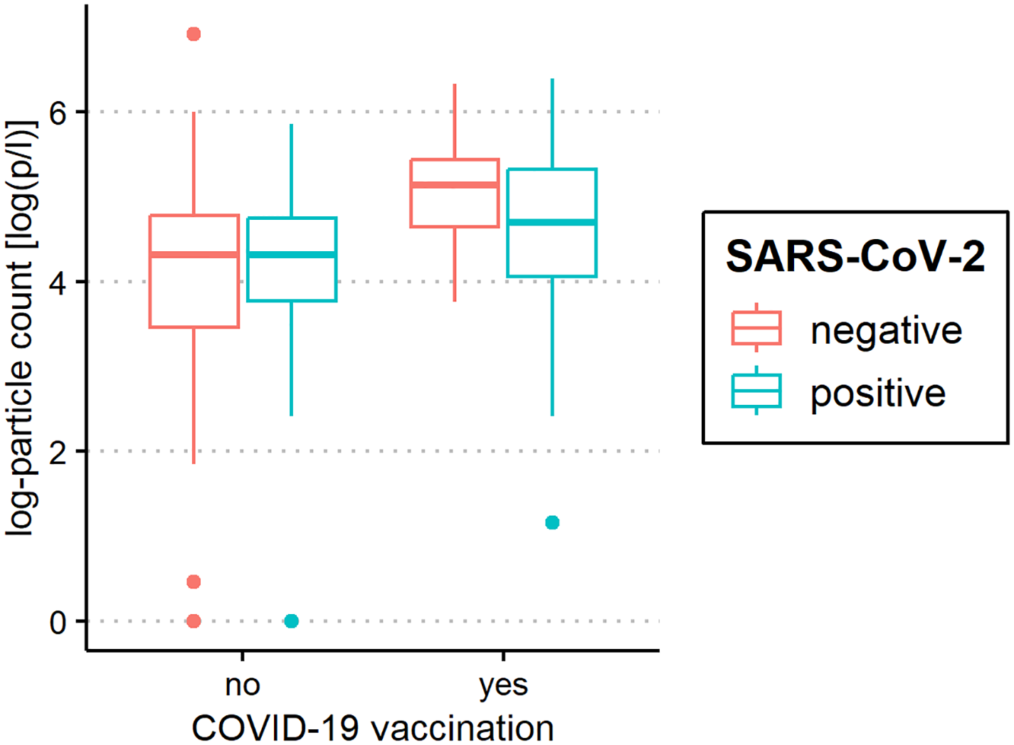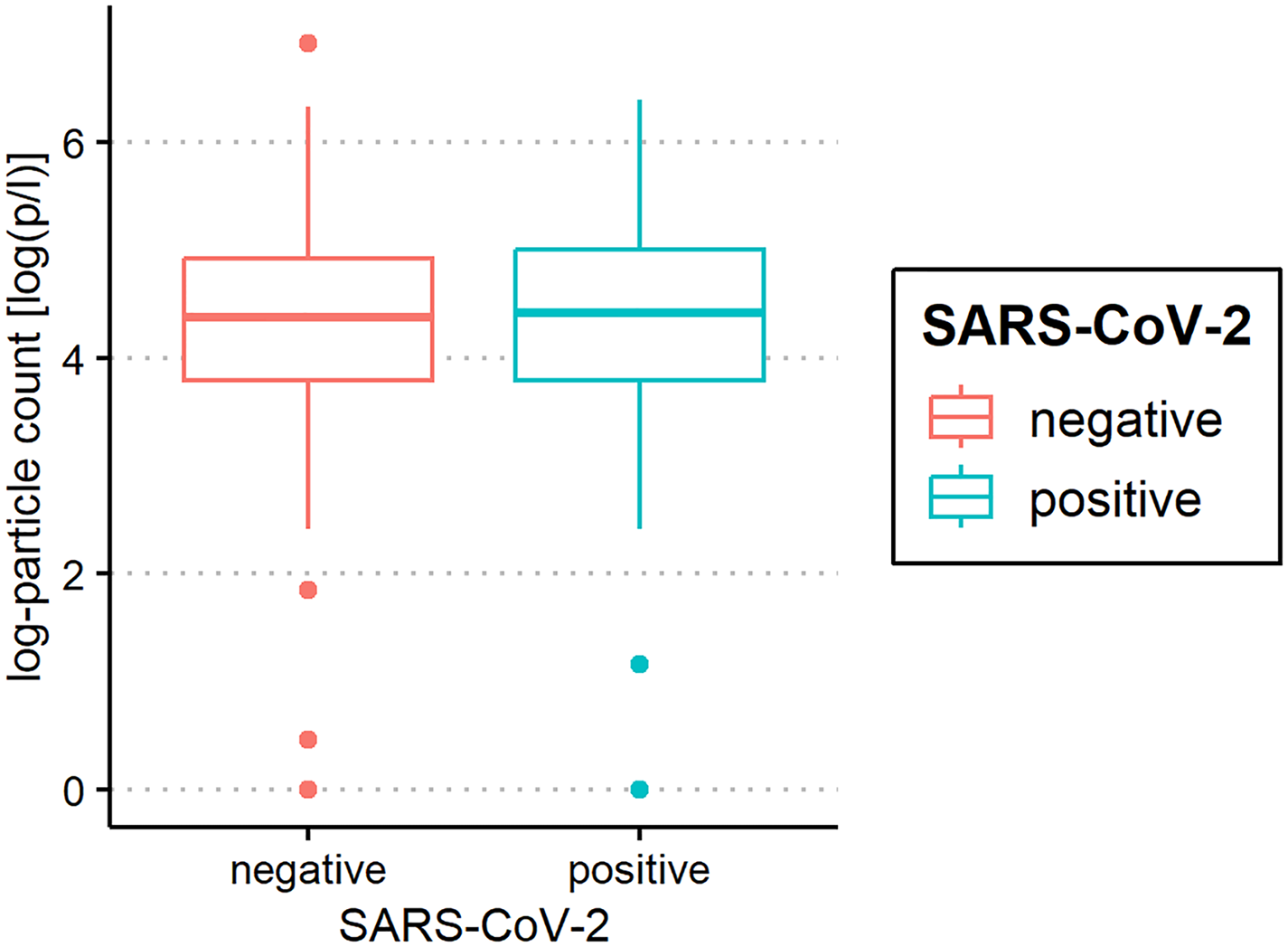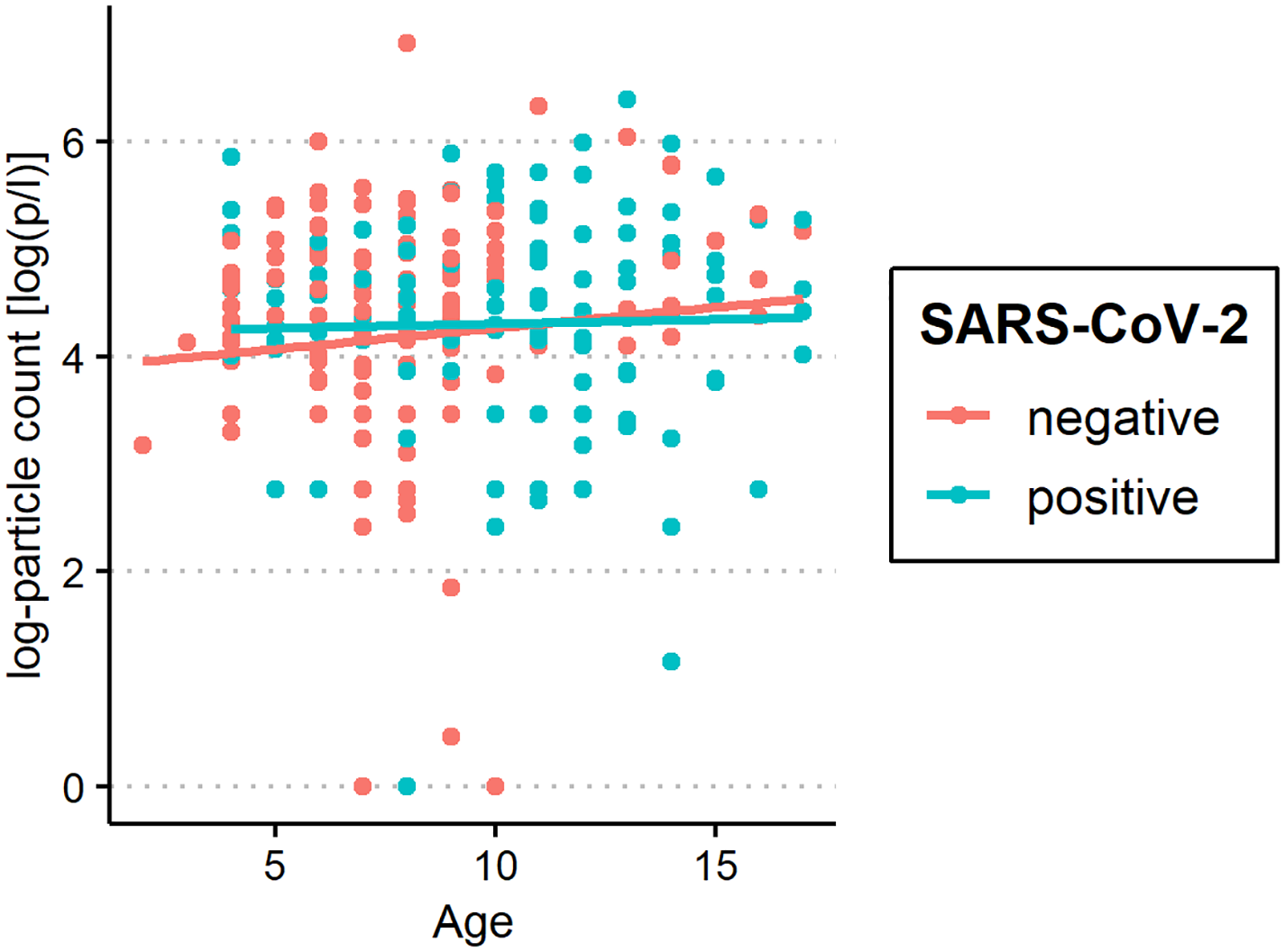 All statistical testing was carried out using linear regression models, with the log-transformed particle count as the target variable. First, bivariate regression models were fitted for each predictor separately. Subsequently, all predictors were entered into a common regression model together with the SARS-CoV-2 infection status to detect potential interaction patterns.