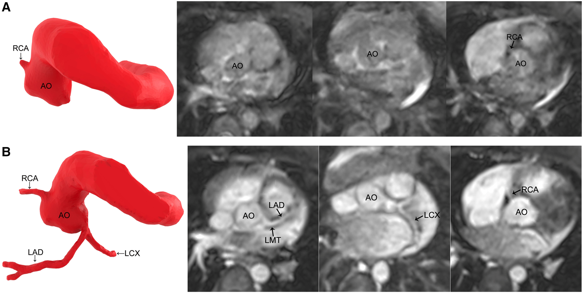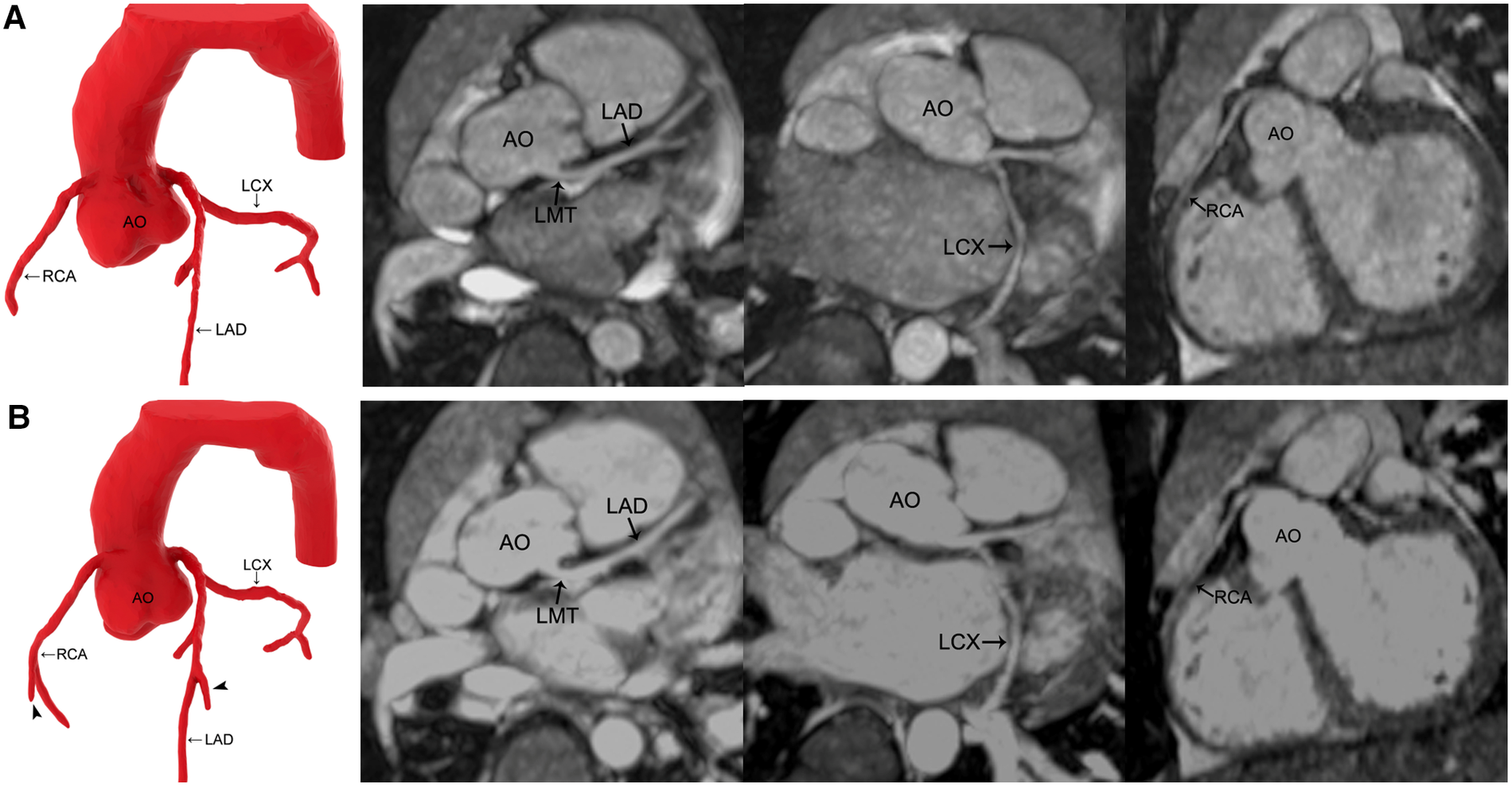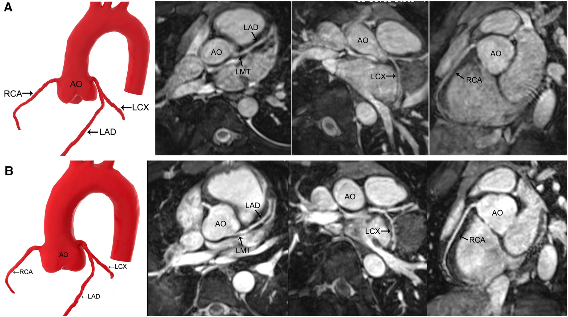 MR coronary angiography in a 7-month-old boy. (A) Noncontrast-enhanced MR coronary angiography only detects the origin of the RCA. (B) Contrast-enhanced MR coronary angiography images reveal all the coronary arteries. The image quality improves significantly. RCA, right coronary artery; AO, aorta; LMT, left main trunk; LAD, left anterior descending coronary artery; LCX, left circumflex coronary artery.
