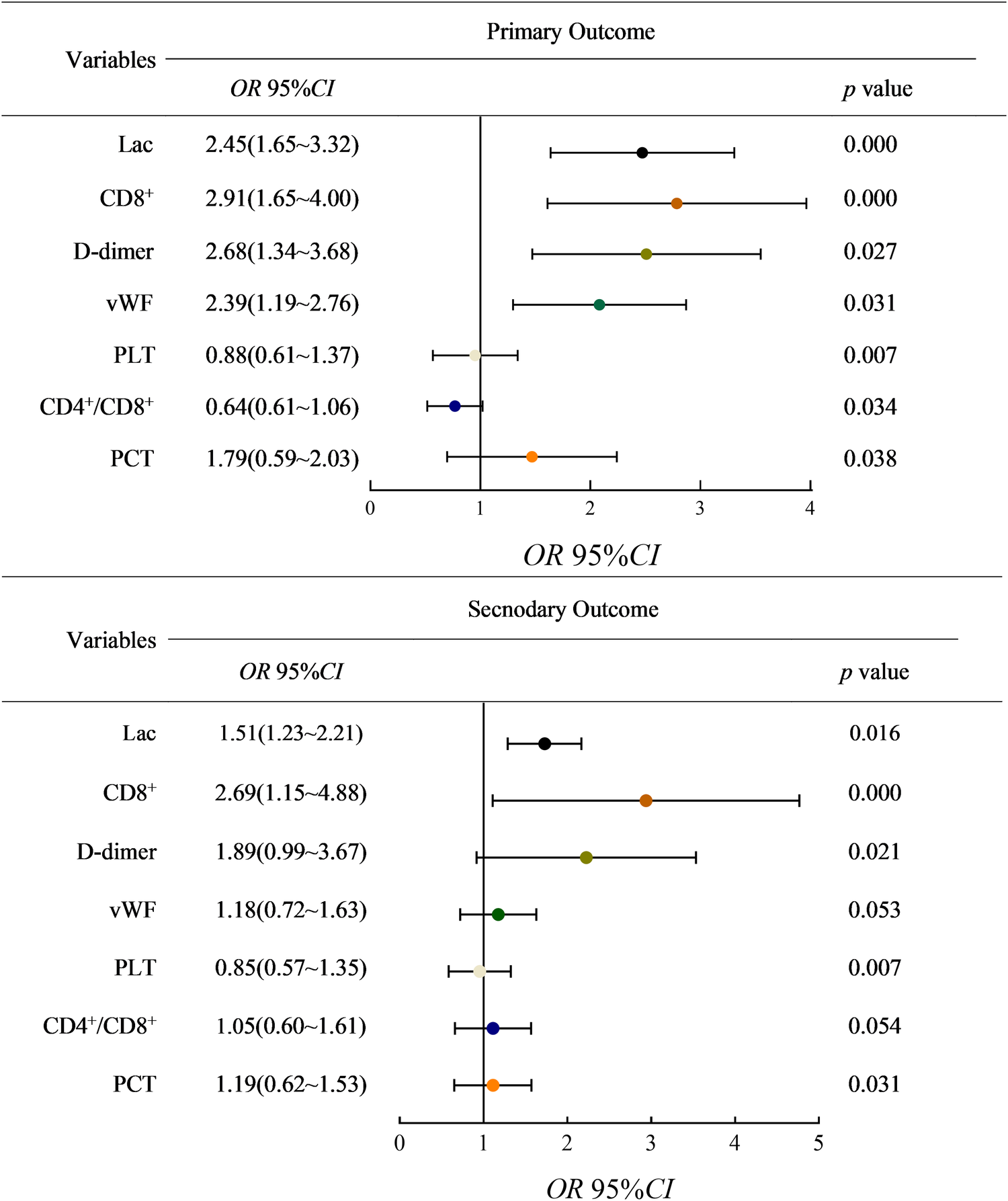 95% confidence interval of related factors for adverse outcomes was performed by regression method. (lac: Lactate; vWF: von Willebrand factor; PLT: platelets count; PCT: serum procalcitonin).