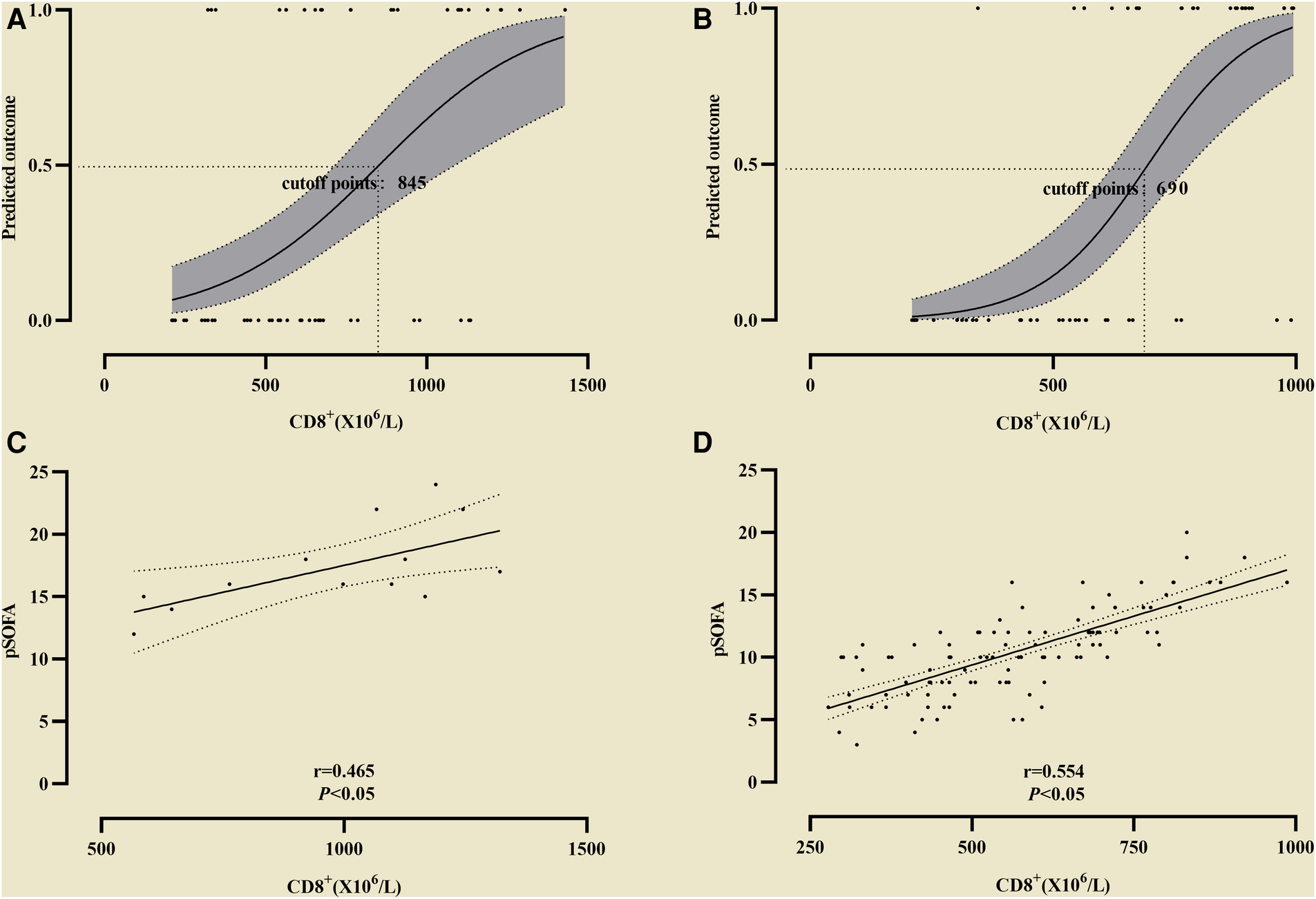 The cutoff value of CD8+ for predicting the differentoutcome. (A) The cutoff value of CD8+ for predicting the primary outcome; (B) The cutoff value of CD8+ secondary outcome. Simple linear regression between pSOFA and CD8+ was performed in the two groups of patients with different prognosis. (C) The correlation coefficient in the non-survival group; (D) The correlation coefficient in the survival group.
