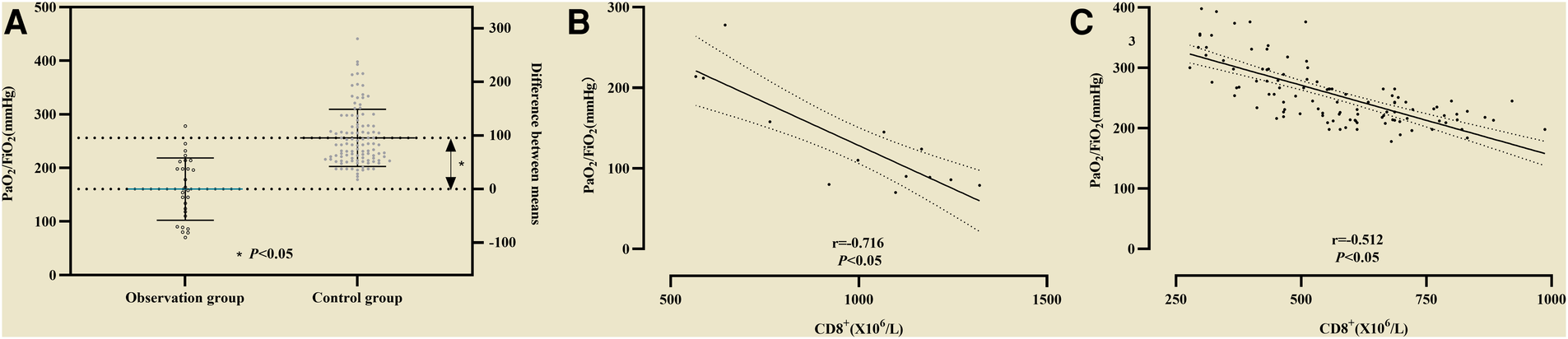 (A) The difference of PaO2/FiO2 between the observation group and the control group was statistically significant. Association of CD8+ with PaO2/FiO2. (B) Correlation analysis between CD8+ and PaO2/FiO2 in non-survival group; (C) Correlation analysis between CD8+ and PaO2/FiO2 in survival group.