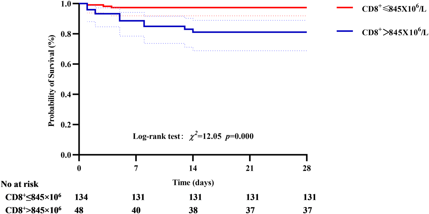 Correlation between CD8+ T cell and 28-day mortality, the cumulative survival rate in the CD8+ T cell >845 × 106 group was significantly lower than that in the CD8+ T cell ≤ 845 × 106 group.