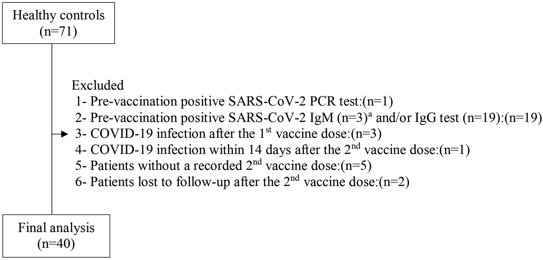 Control group selection flow chart. aAll cases with a positive SARS-CoV-2 IgM test were also positive for SARS-CoV-2 IgG test.