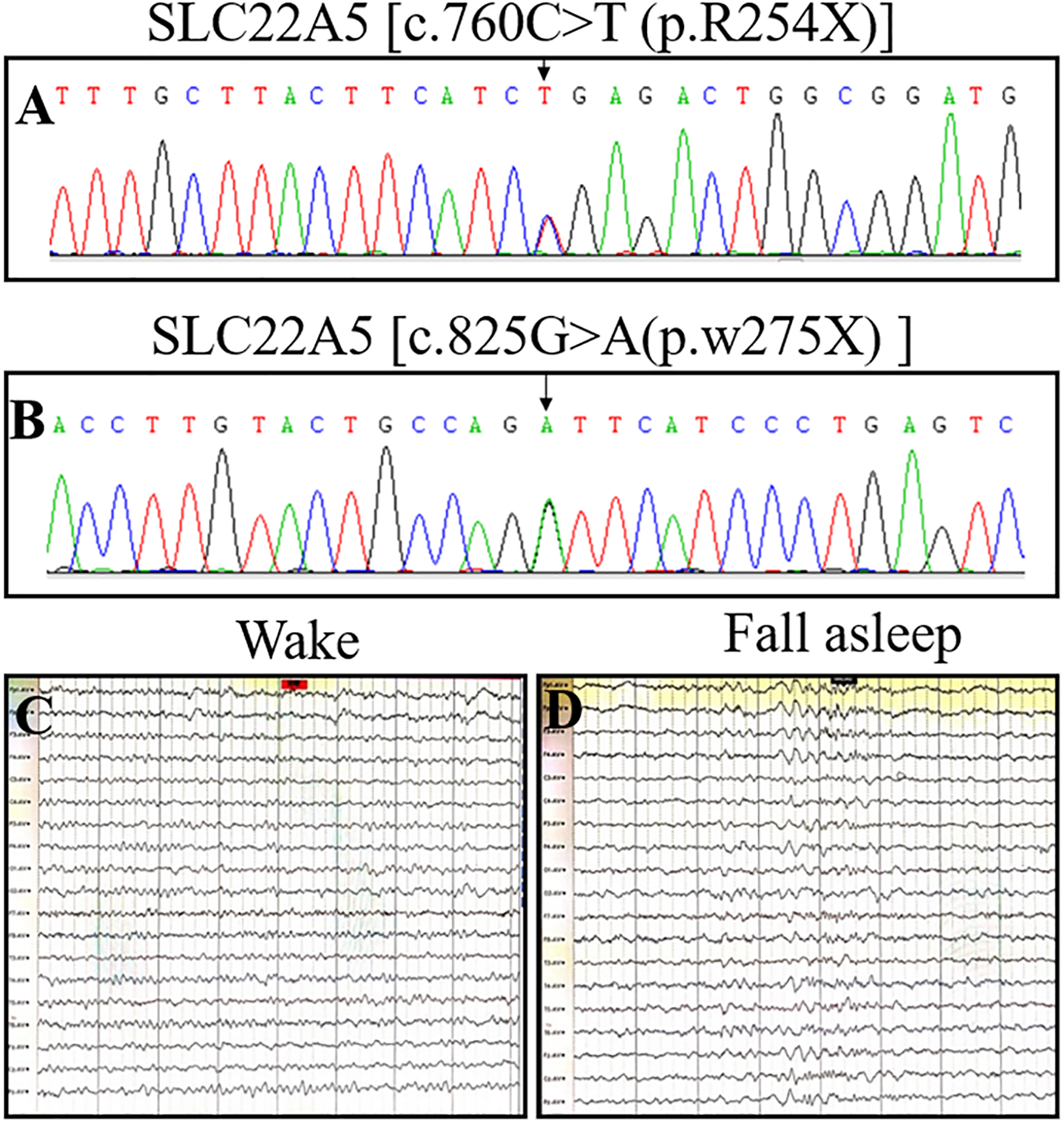 OCTN2 mutations and electroencephalograms of a 4-month-old girl (the proband) with primary carnitine deficiency. (A) Mutation [c.760C > T (p.R254X)] in the SLC22A5 gene in the proband. (B) Mutation [c.825G > A (p.w275X) ] in the SLC22A5 gene in the proband. (C and D) EEG of the proband was recorded in November 2021 when she was 4 years and 8 months old and had already received four years of treatment. The electroencephalogram indicated no seizures on either wakefulness or Non-REM Phase II.
