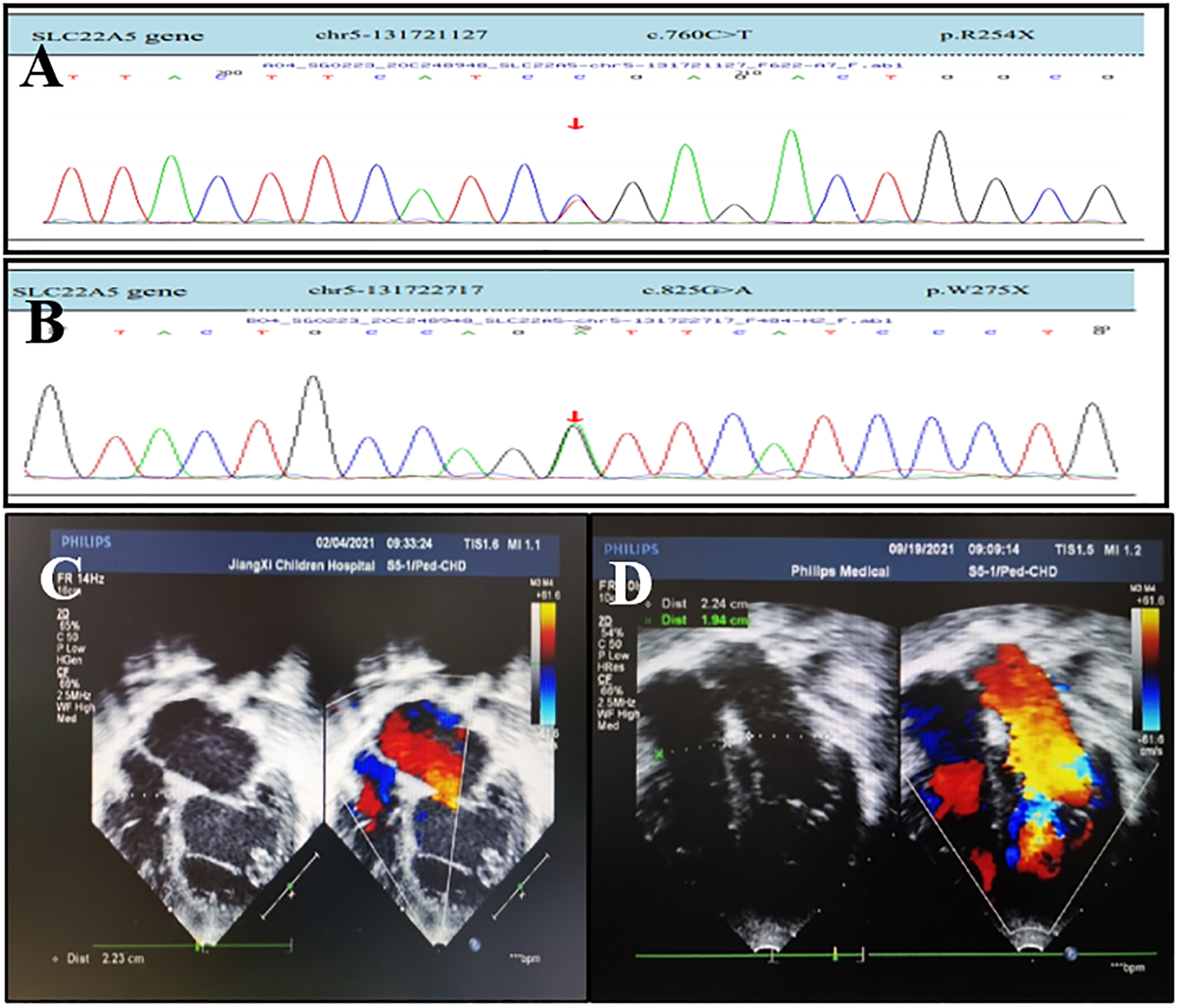 OCTN2 mutations and echocardiography of a 6-year-and 4-month-old boy (the proband's brother) with primary carnitine deficiency. (A) Mutation [c.760C > T (p.R254X)] in the SLC22A5 gene. (B) Mutation [c.825G > A (p.w275X) ] in the SLC22A5 gene. The arrows indicate the site of the mutation. (C) Transthoracic echocardiography (TTE) of the boy was performed in February 2021 when he was 6 years and 4 months old and did not receive treatment. (D) TTE of the boy after 6 months of treatment in September 2021. TTE parasternal four-chamber view shows diameter changes of heart chambers before and after 6 months of treatment.