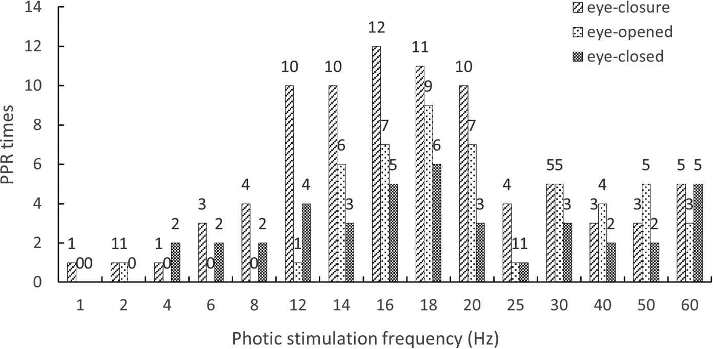 Among the 31 patients, 2 failed to complete the IPS test because of a rapid induction of the PPR (1 induced PPR in eye closure and 1 in all three eye states mentioned previously); thus, they were excluded from this statistical analysis. A total of 193 PPRs were monitored in the remaining 29 patients. The PPR rate varied with the increasing frequency of photic stimulation during the IPS test, and the maximum frequency sensitivity of the PPR evoked ranged from 10 to 20 Hz (125/193, 64.77%) in all the three eye states of the patients (Figure 1). In the different eye states, 95 PPRs were induced in the eye-closure state, 53 in the eye-opened state, and 45 in the eye-closed state. The occurrence of induced PPR in the eye-closure state was higher than that in the other states. The PPR was recorded in all IPS frequency ranges (1–60 Hz) in the eye-closure state. In other words, it is easier to induce the PPR by IPS in the eye-closure than in the other eye states.