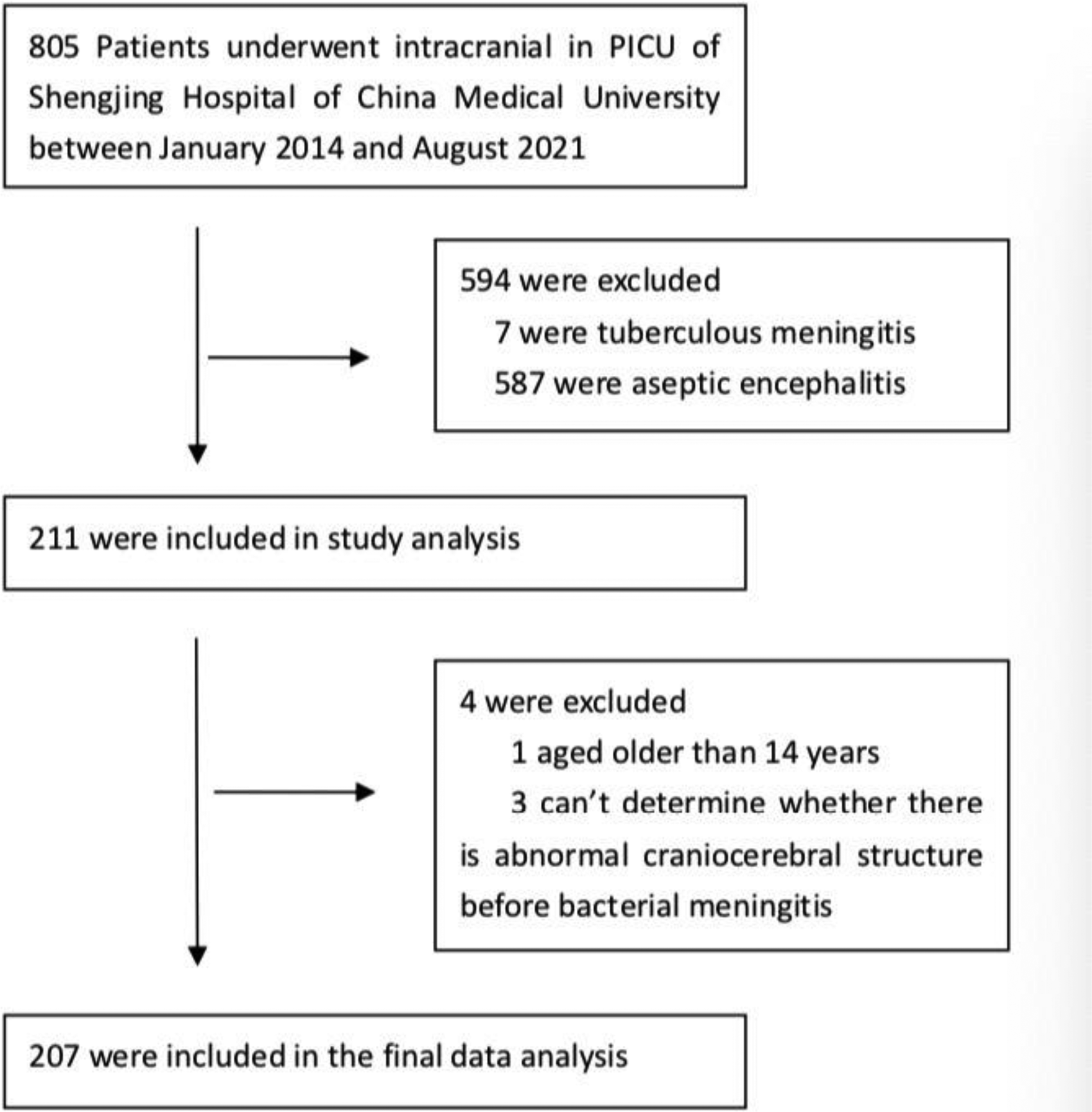 This was a retrospective single-center cohort study of 207 patients who were admitted in the pediatric intensive care unit (PICU) of Shengjing Hospital of China Medical University between January 2014 and August 2021. All patients were diagnosed with bacterial meningitis and were aged between 29 days and 14 years. They were divided into complex and simple groups according to the presence of ACS before the contraction of BM. Complex BM was defined as BM with ACS pre-existing the onset of infection, which is related to prior clinical diagnosis. ACS includes congenital defects in the integrity of the brain and spine, damage to the integrity of the skull base due to various reasons, damage to the sealing structures of the skull and vertebral bodies, damage to the meninges, and primary or secondary hydrocephalus. Simple BM was defined as BM without ACS. Patients were eligible to participate in the study if they met the following inclusion criteria: (1) patients diagnosed with BM, (2) patients aged 29 days to 14 years, and (3) patients whose abovementioned ACS could possibly be determined before the contraction of BM. The exclusion criteria were as follows: (1) patients diagnosed with tuberculous meningitis or aseptic encephalitis, and (2) where it was not possible to determine the presence or otherwise of ACS before BM. The flowchart for patient enrollment is given in Figure 1. Information related to demographics, symptoms and signs on admission [convulsion, Glasgow Coma Scale (GCS), shock, multiple organ dysfunction syndrome (MODS)], laboratory findings [cerebrospinal fluid (CSF), blood routine, inflammatory indicators, and pathogens] at admission and during hospitalization, clinical course, treatment (antibiotics, corticosteroids, intrathecal injection, and drainage) and neurological findings [computed tomography (CT) and magnetic resonance imaging (MRI)] at discharge, and final outcomes was collected from the medical records of the patients. During the period of treatment, the GCS score was recorded, because this is the time when it is the lowest. The CSF samples were collected for the first time with symptoms of BM. The pediatric clinical illness score (PCIS), pediatric risk of mortality III (PRISM III), blood routine, and inflammatory indicators were recorded within 24 h after the samples were obtained. Blood and CSF cultures were positive specimens at any time during hospitalization, and therefore, specimen contamination was excluded from the analysis. A head CT was done on patients within 24 h of their admission to the PICU. Patients who completed head CT or MRI examination again before discharge were examined for new or exacerbated abnormalities after neuroimaging of meningitis.