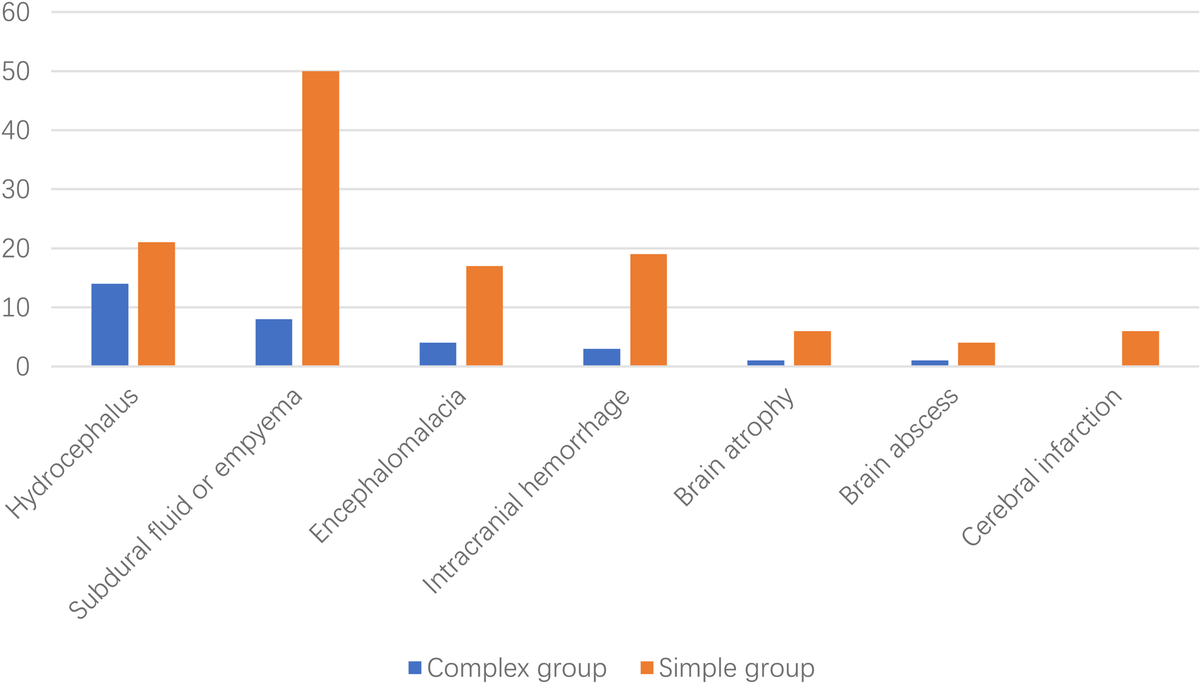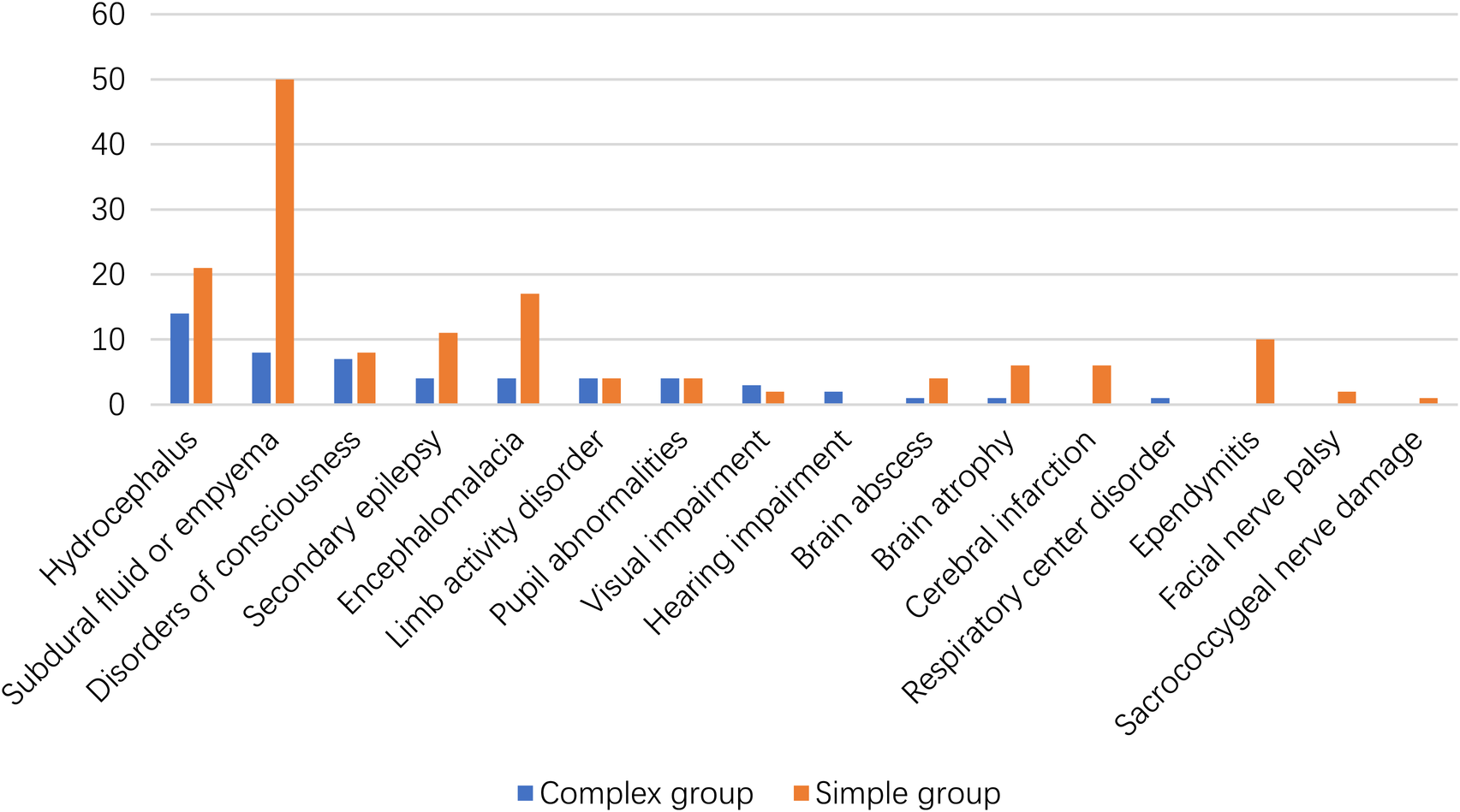 A total of 207 patients were included in the study (46 in the complex group and 161 in the simple group). Patients in the complex group had a lower mortality rate (6.5% vs. 11.2%, p < 0.05), positive blood culture (13.0% vs. 34.8%; p < 0.05), multiple organ dysfunction syndrome (0% vs. 9.3%; p < 0.05), and shock (2.2% vs. 9.3%; p = 0.11). These patients were more often detected with neurological sequelae (80.4% vs. 53.4%; p < 0.05), cerebrospinal fluid drainage (50% vs. 15.5%; p < 0.05), nosocomial infection (54.3% vs. 3.1%; p < 0.05), and multidrug-resistant bacteria (62.5% vs. 55.6%, p = 0.501). In patients in the simple group, infection was mostly confined to the nervous system.