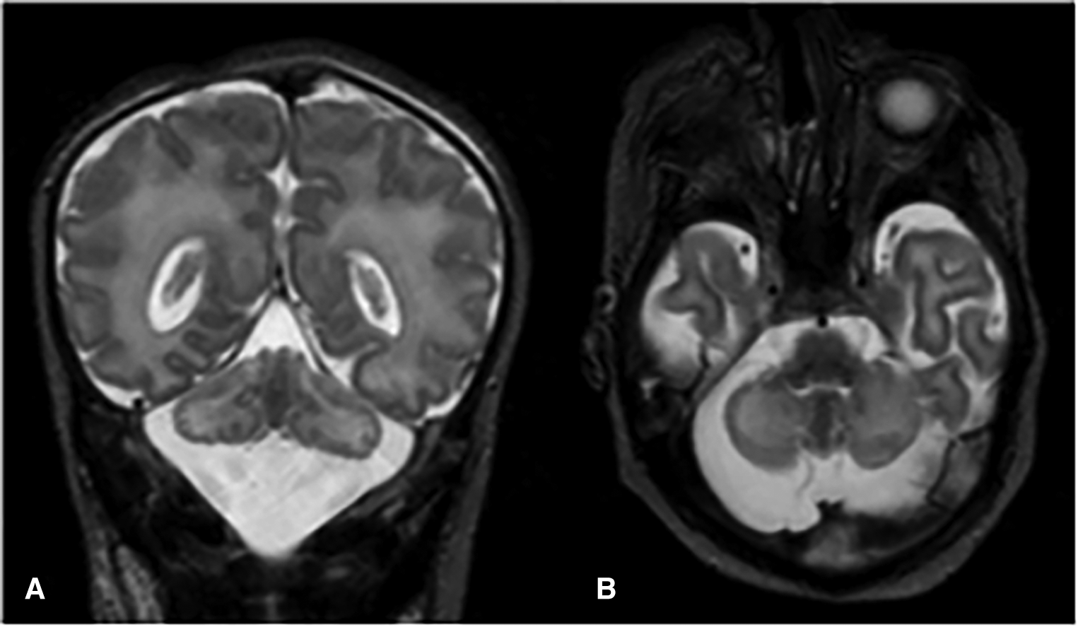 Coronal (A) and axial (B) T2-weighted images show global cerebellar hypoplasia with symmetric involvement of both hemispheres and vermis, along with a very large cisterna magna. There was no obvious abnormality of the brainstem. The cerebellar folia and fourth ventricle were not dilated, indicating there was no volume loss. The cerebellar foliation pattern was normal and there were no heterotopic nodules of gray matter, indicating there was no dysplasia.