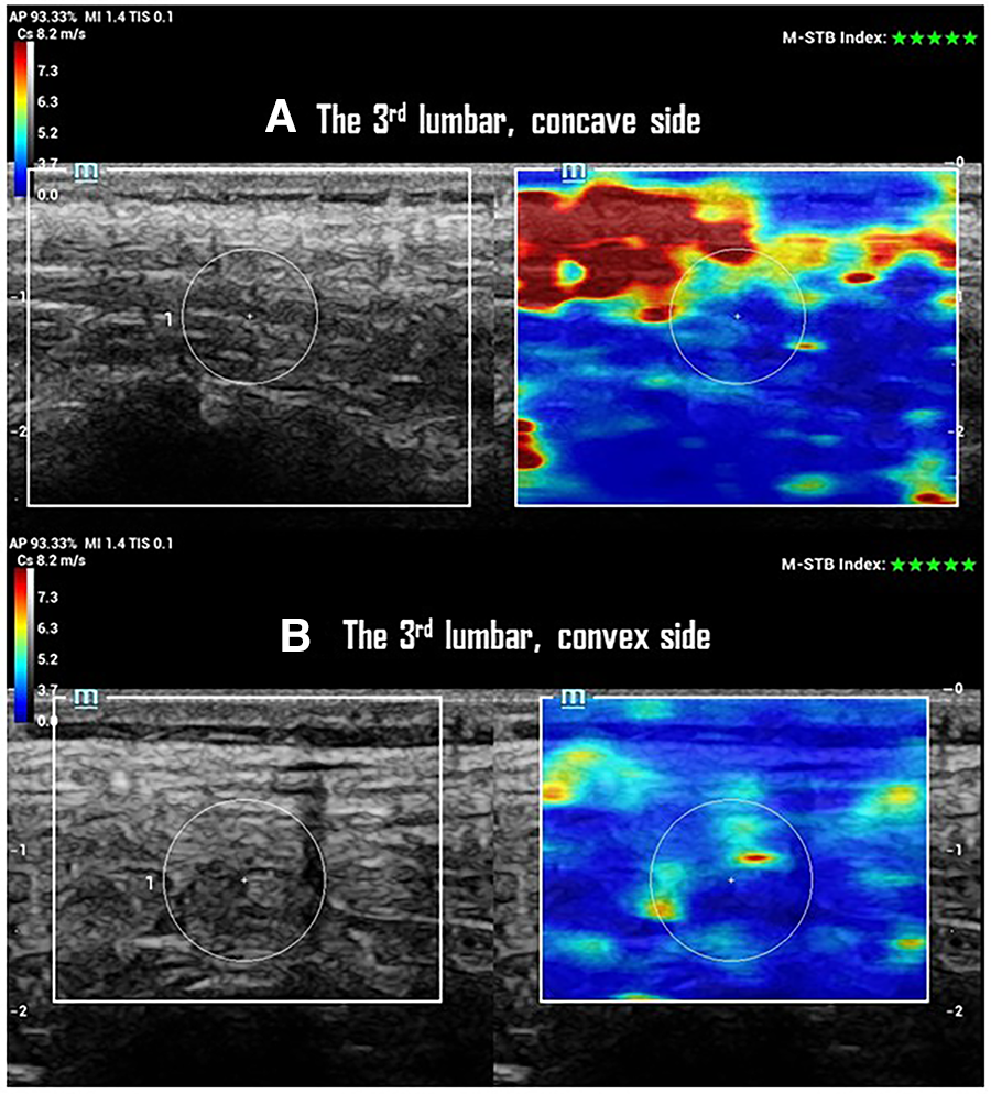 The reliability tests involved four AIS and two non-scoliosis participants, with two operators participating. The SWS and CST were measured by each operator five times at 3 cm horizontally away from spinal process of AV on the convex and concave sides of the major curve in participants with AIS, and at the T8 and L3 vertebrae in non-scoliosis controls. These repeated measurements demonstrated strong interoperator reliability for both SWS (multifidus intraclass coefficient [ICC3,2]: 0.90, longissimus [ICC3,2]: 0.92, iliocostalis [ICC3,2]: 0.90) and CST (multifidus [ICC3,2]: 0.89, longissimus [ICC3,2]: 0.93, iliocostalis [ICC3,2]: 0.88) and consistent intraoperator repeatability across consecutive trials for SWS (multifidus: coefficient of variation [CV] 1.4%–2.3%, longissimus: [CV] 1.1%–2.0%, iliocostalis: [CV] 1.8%–2.1%) and CST (multifidus: [CV] 3.1%–4.0%, longissimus: [CV] 2.9%–3.6%, iliocostalis: [CV] 2.4%–4.1%).