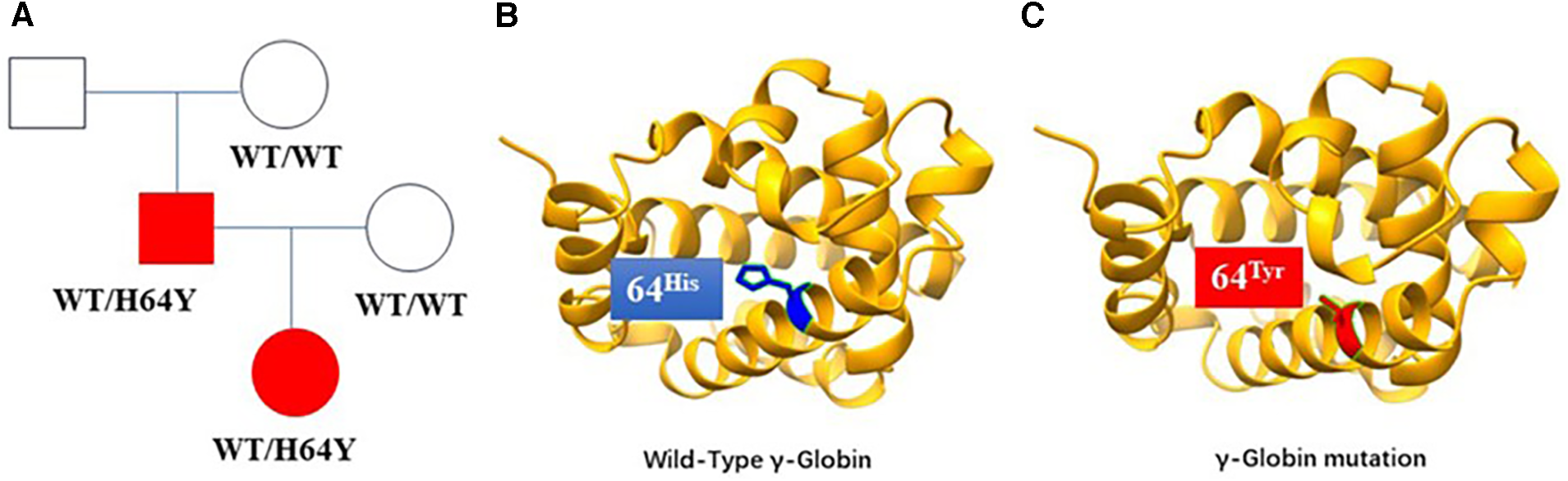 (A) Gamma-haemoglobin mutation lineages, with squares representing male members, circles representing female members, and shadows representing the case and her proband's father. (B) The schematic diagram of the wild-type structure of haemoglobin. (C) The predicted structure of the haemoglobin mutation in the patient. The heterozygous mutation of nucleotide 190 from cytosine C to thymine T (c.190C>T) resulted in the change of amino acid 64 from histidine to tyrosine.