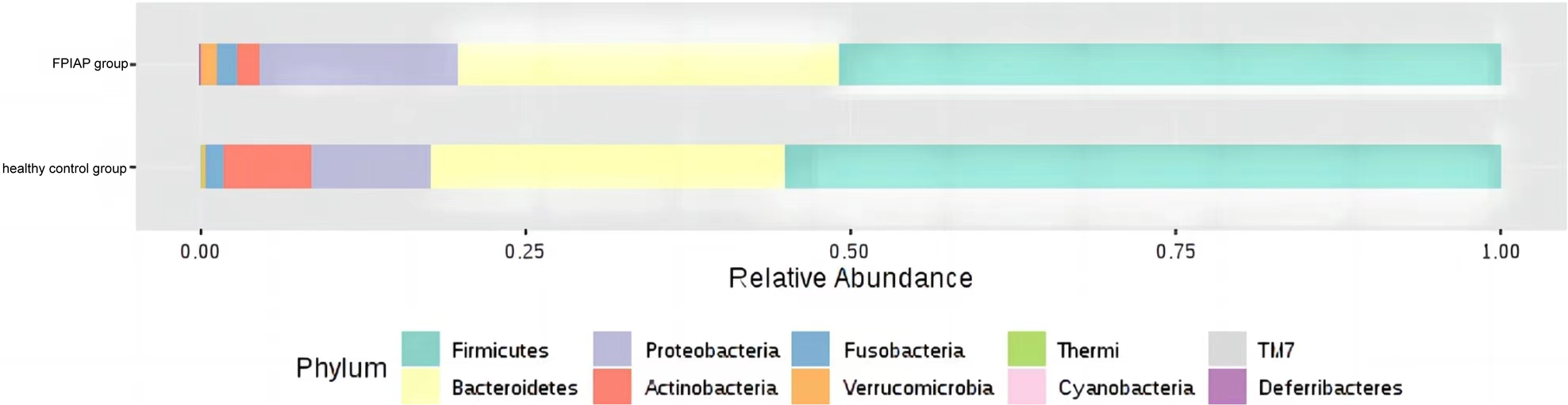 Differences in relative abundance at the level of the FPIAP infant gut microbiota phylum.