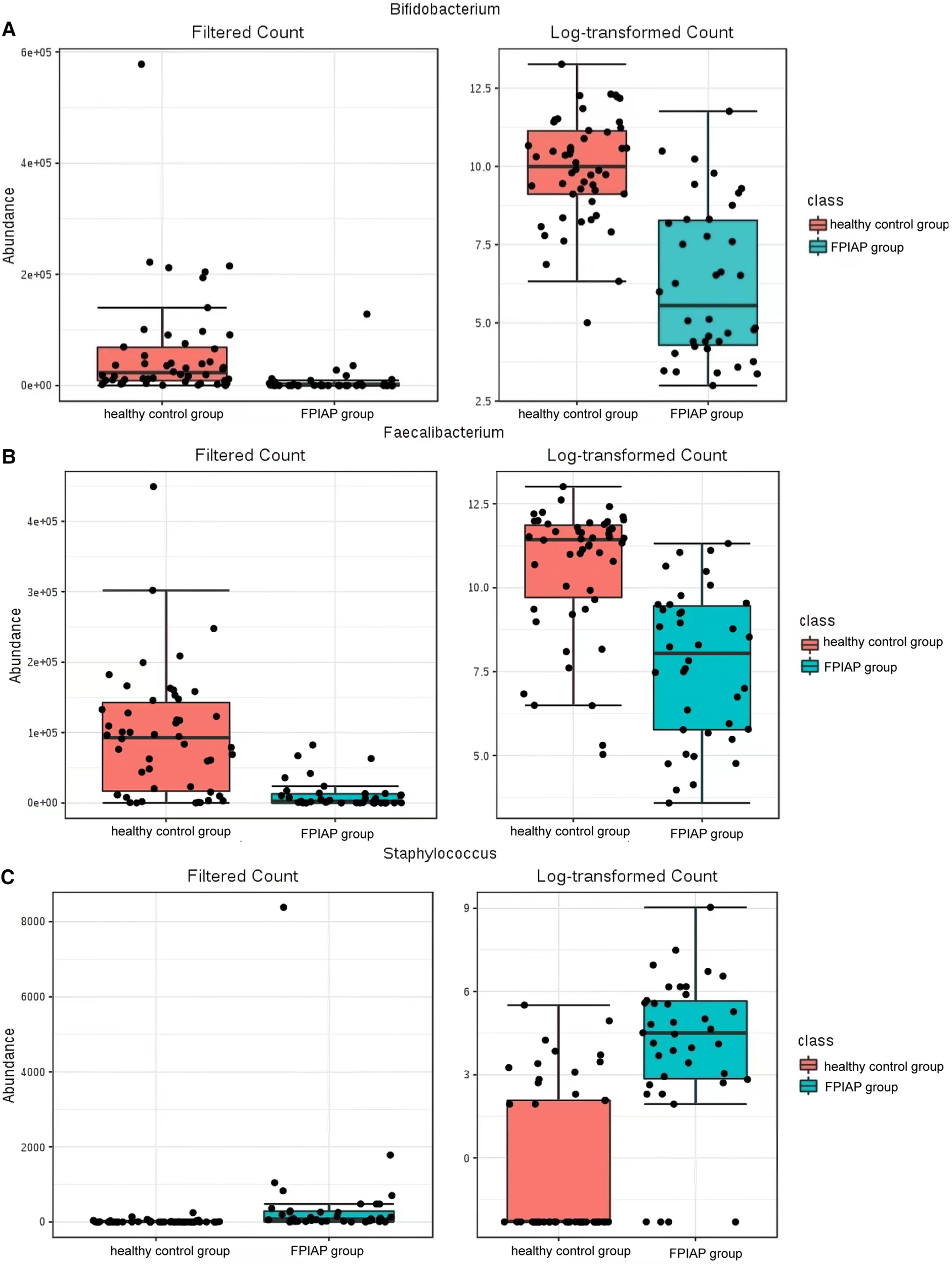 There were 36 patients in the FPIAP group: 20 males and 16 females, age 21.944 ± 13.277 months. Diarrhea with blood in the stool were the main symptom, with an average course of 14.83 ± 9.33 days. Thirty infants (83.33%) had mucus stool, 11.11% (4/36) of them experiencing vomiting, and 55.56% (20/36) of the infants displaying poor intake and weight gain, 28 (77.78%) patients with moderate eczema, 2 (5.6%) patients with chronic respiratory symptoms. The treatment time with amino acid formula was 5.51 ± 2.88 months. A control group comprising of 25 healthy infants who were full-term, natural delivery, bottle fed, and matched in terms of age (24.840 ± 12.680 months) and gender (15 males and 10 females) was selected. Anaerobic bacteria were less abundant in FPIAP infants than healthy infants (P = 4.811 × 10−5), but potentially pathogenic bacteria were more abundant (P = 0.000). The abundance of Actinobacteria was low in FPIAP infants, the abundance of Proteobacteria was high, and the abundance of Firmicutes was reduced. Bifidobacterium could be used as a bacterial genus to differentiate healthy and FPIAP infants. Both α-and β-diversity indicators of intestinal microbiota were lower in FPIAP infants. In FPIAP infants, glucose and energy metabolism and amino acid anabolism were decreased, and inflammation-related lipopolysaccharide synthesis pathways were increased.