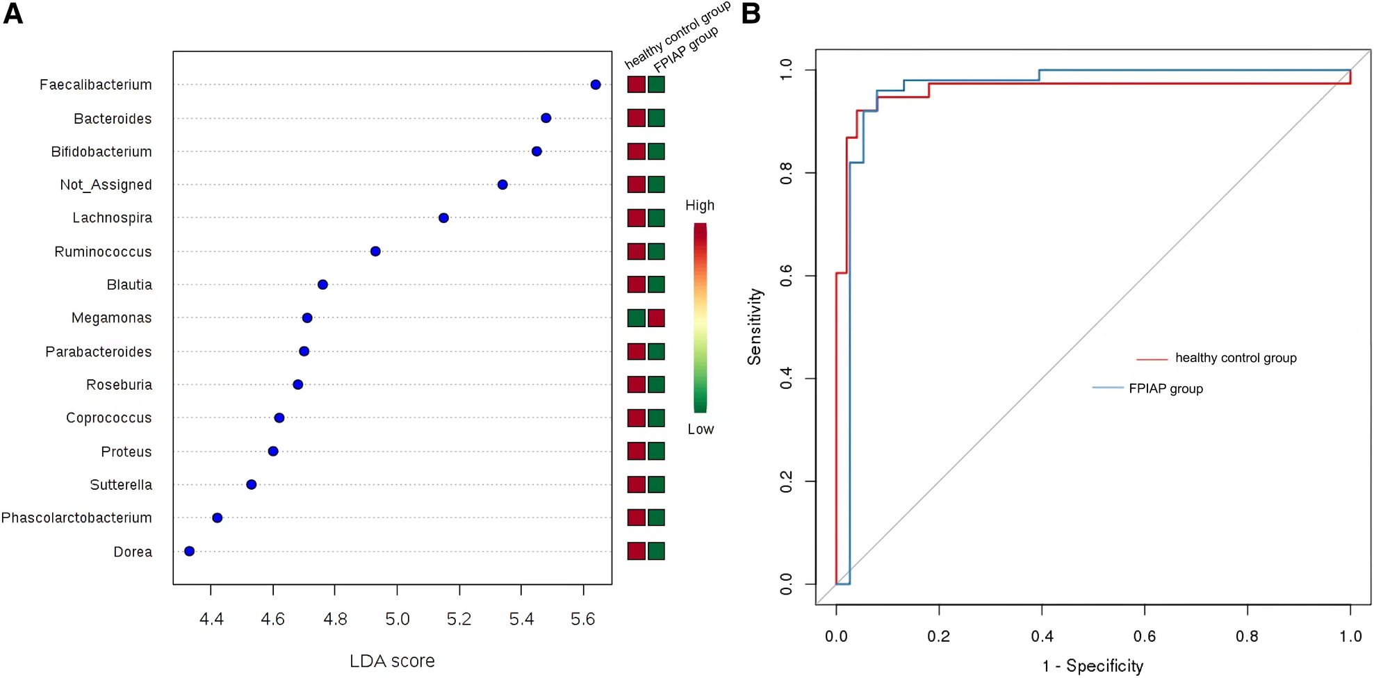 LEfSe analysis screened out landmark communities with LDA score >2. Bacillus faecalis, Bacteroides, and Bifidobacterium were significantly higher in healthy children than in FPIAP infants, but some other common symbiotic bacteria decreased in the FPIAP group. Megamonas was significantly lower in the FPIAP group than in the healthy group. Random forest analysis suggested that Bifidobacterium could be used as a characteristic differential genus to distinguish healthy infants from FPIAP infants. The receiver operating characteristic (ROC) curve suggested its high sensitivity (AUC = 0.96) (Figures 4A,B).