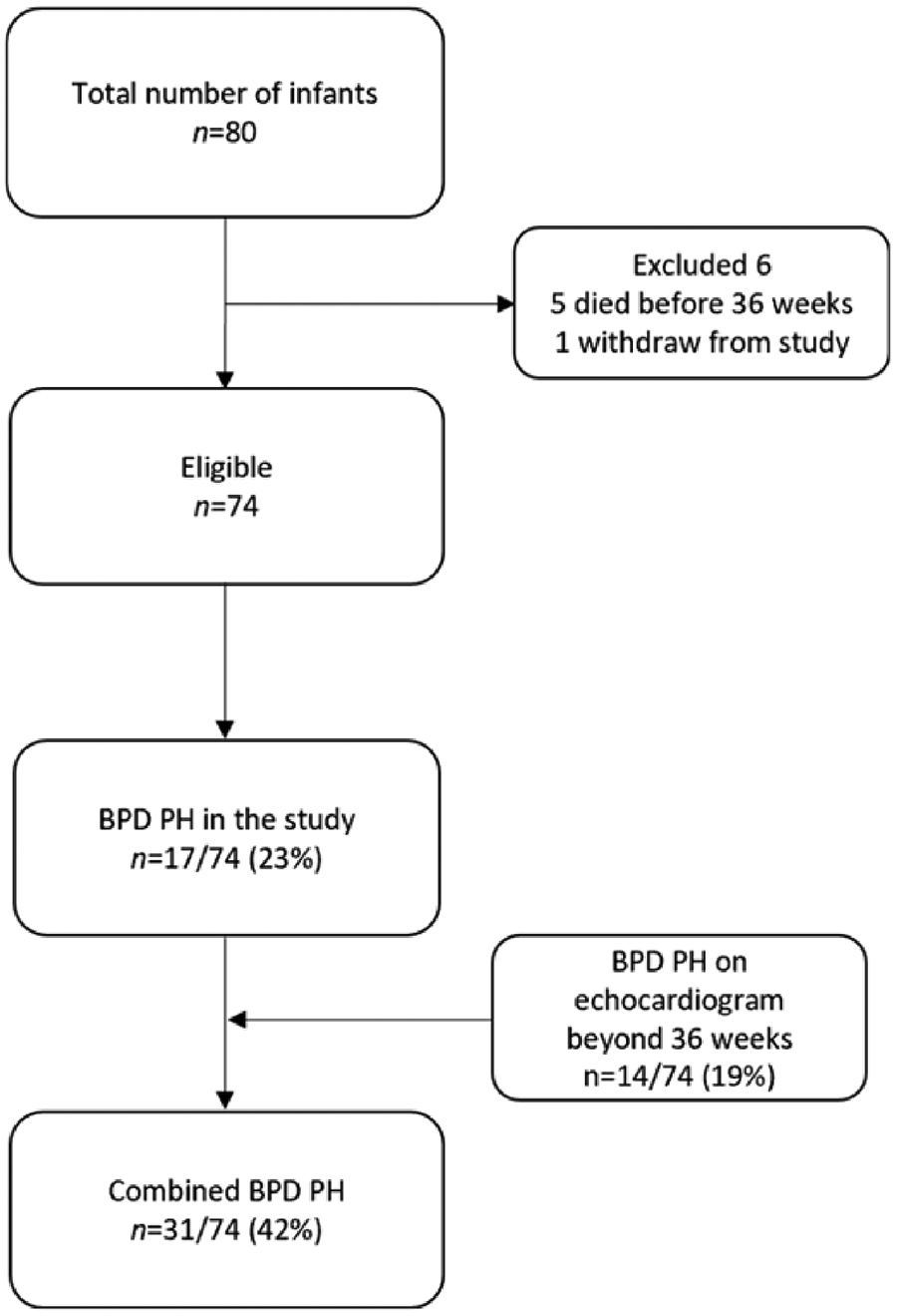 A total of 80 infants were recruited into the study, and 74 infants were included in the final analysis, as shown in Figure 1. Five infants died before the post-conceptual age of 36 weeks and one infant withdrew from the study. The incidence of BPD-PH was 23% in our cohort. An additional 14 infants showed PH on continued screening beyond 36 weeks of gestation (mean age of diagnosis 39.5 ± 6.42 weeks) making the total incidence of BPD-PH 41%.