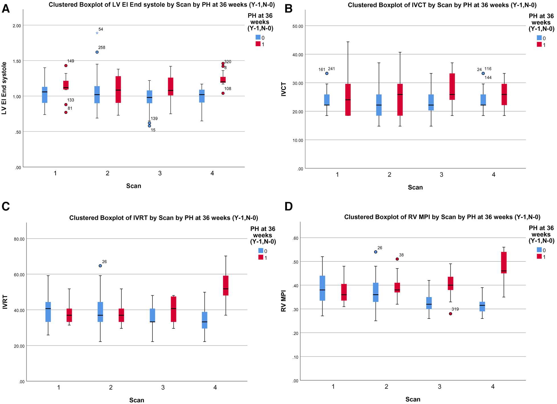 Infants born at <28 weeks of gestation were recruited into the study. We excluded infants born with major congenital anomalies. Each recruited infant had their first comprehensive echocardiogram involving both conventional and TDI at 7–10 days of life (scan 1) and 4-weekly scans (scan 2: 29.4 ± 1.17 weeks, scan 3: 33.8 ± 1 weeks, scan 4: 36.7 ± 0.5 weeks) thereafter until 36 weeks of corrected age. At a postmenstrual age of 36 weeks, the presence of BPD-PH was diagnosed using the conventional echocardiographic parameters. The infant was diagnosed with BPD-PH if there was a tricuspid regurgitation (TR) jet maximum velocity >2.8 m/s or a combination of left ventricular eccentricity index of more than 1.15 and the ratio of acceleration time to RV ejection time (ACT/RVET) <0.3 (14–16). The TDI markers were then compared between BPD-no PH and BPD-PH groups at each period.