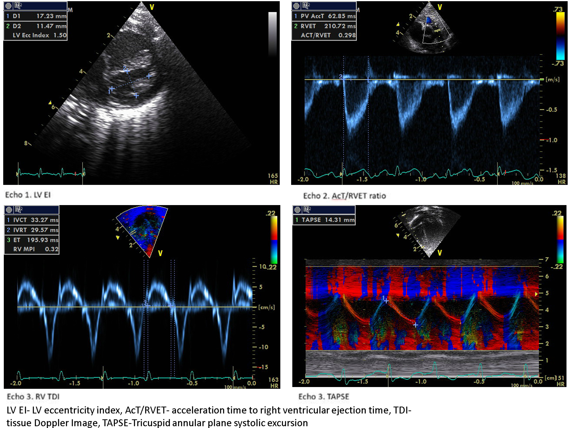 We measured tricuspid jet velocity, TR systolic to diastolic ratio, ratio of pulmonary artery acceleration time to RV ejection time, RV dimensions on four-chamber, short axis, and long-axis views, LV eccentricity index (LVEI) (end diastole, end systole, average), and tricuspid and mitral E/A ratio as conventional echocardiographic parameters. Tissue Doppler images were obtained at the lateral mitral and tricuspid annulus (pulse wave on color-coded TDI). TDI measurements collected were isovolumetric contraction time, isovolumetric relaxation time, and ejection time. Other TDI parameters were S’, E’, A’, isovolumetric velocity, and E/E’ ratio. All the images were analyzed on site.