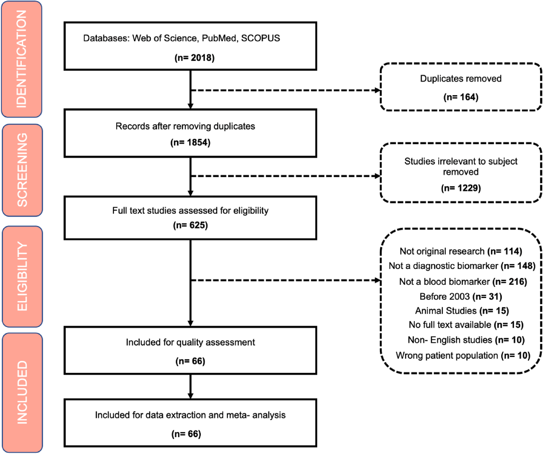 Exclusion criteria included: (1) Non-primary research, literature reviews, letters to the editor; (2) animal studies; (3) Non-diagnostic biomarkers; (4) studies published prior to 2003; (5) non-blood biomarkers; (6); (7) duplicate articles, 8) non-English studies (Figure 1).
