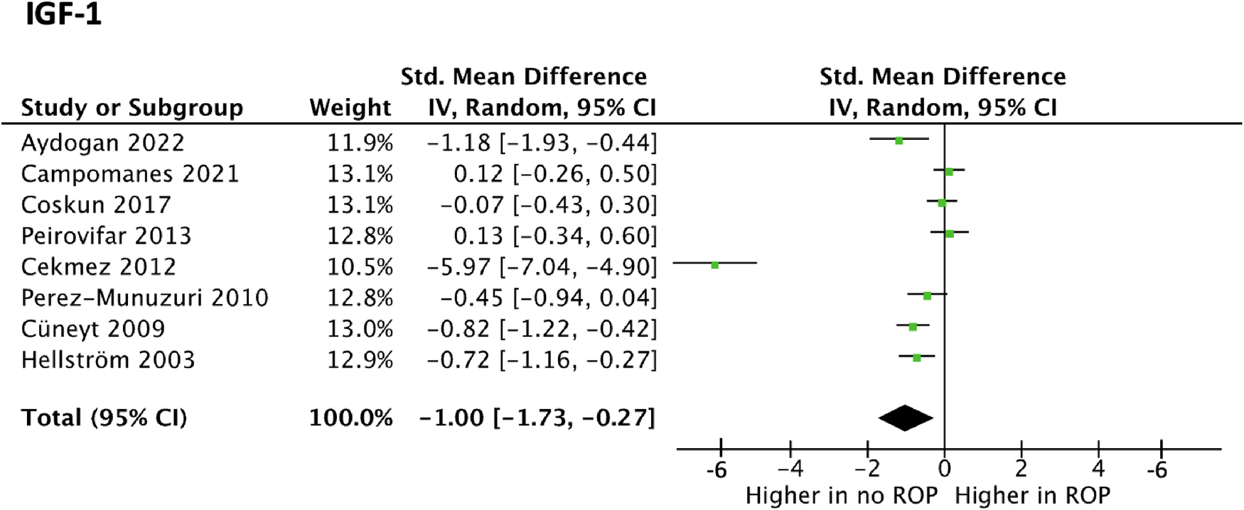 A total of 8 studies investigating IGF-1 were suitable for meta-analysis. Meta-analysis revealed statistically significant data (p value < 0.01) with a SMD [95% confidence interval] of −0.46 [−0.63, −0.30] as seen in Figure 2. This suggests IGF-1 levels may be greater in preterm infants without ROP compared to controls.