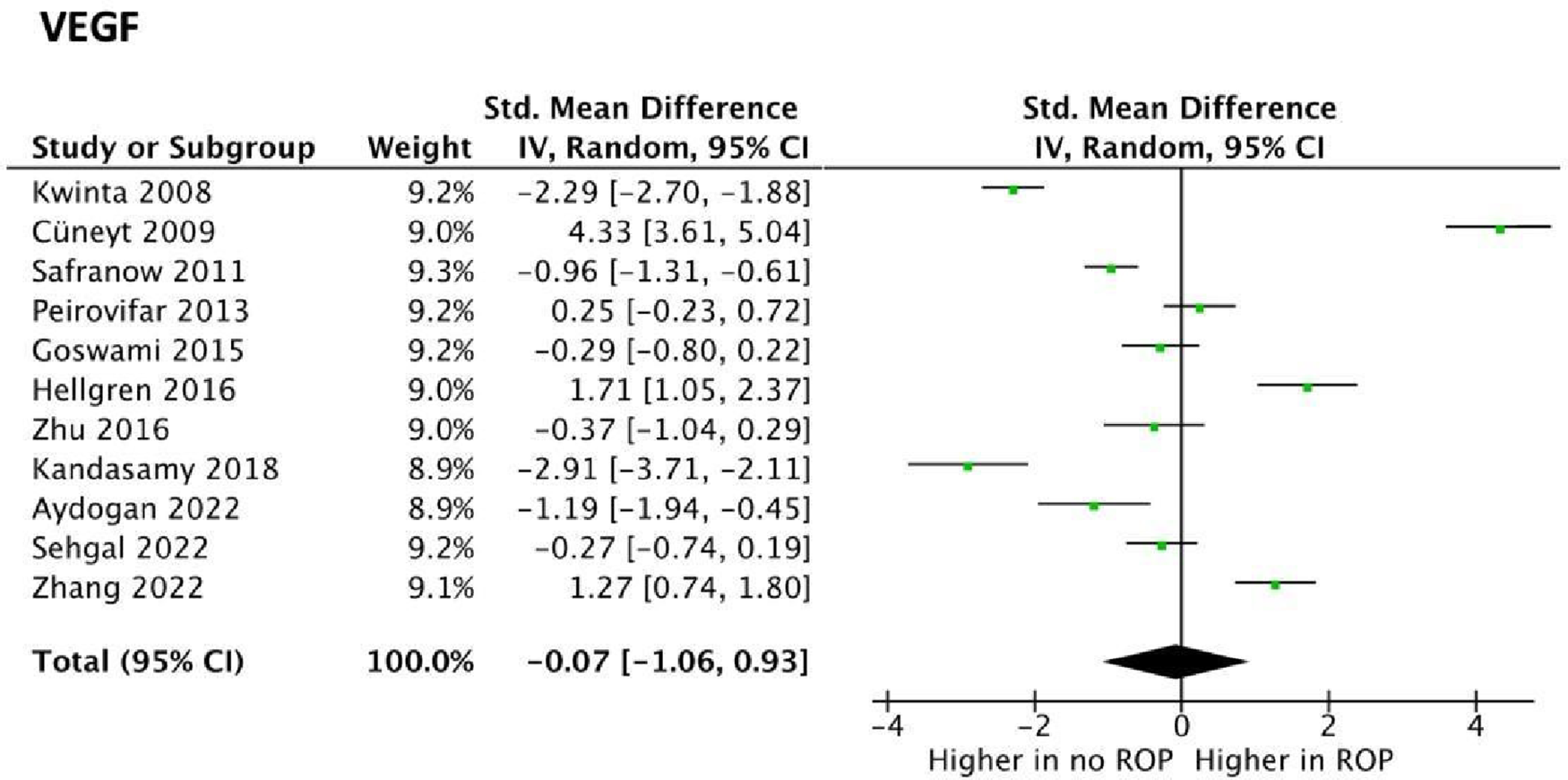 VEGF was explored as a potential biomarker in 17 studies, all of which utilised ELISA. Of these, 8 studies reported higher serum VEGF levels associated with the development of ROP. No statistically significant difference in serum VEGF concentrations in infants who did not have ROP and those who did was found in 9 studies. VEGF levels in ROP were suitable for meta-analysis in 11 studies. Meta-analysis revealed statistically significant data (p value <001) with a SMD [95% confidence interval] of −0.07 [−1.06, 0.93] as seen in Figure 3. This suggests VEGF may be lower in preterm infants with ROP. However, studies had highly heterogeneous results (I2 = 97%) and, more importantly, the confidence interval crossed the neutral line in Figure 3. These findings both suggest that no conclusions can be drawn on whether VEGF levels in fact differ in premature infants with or without ROP.