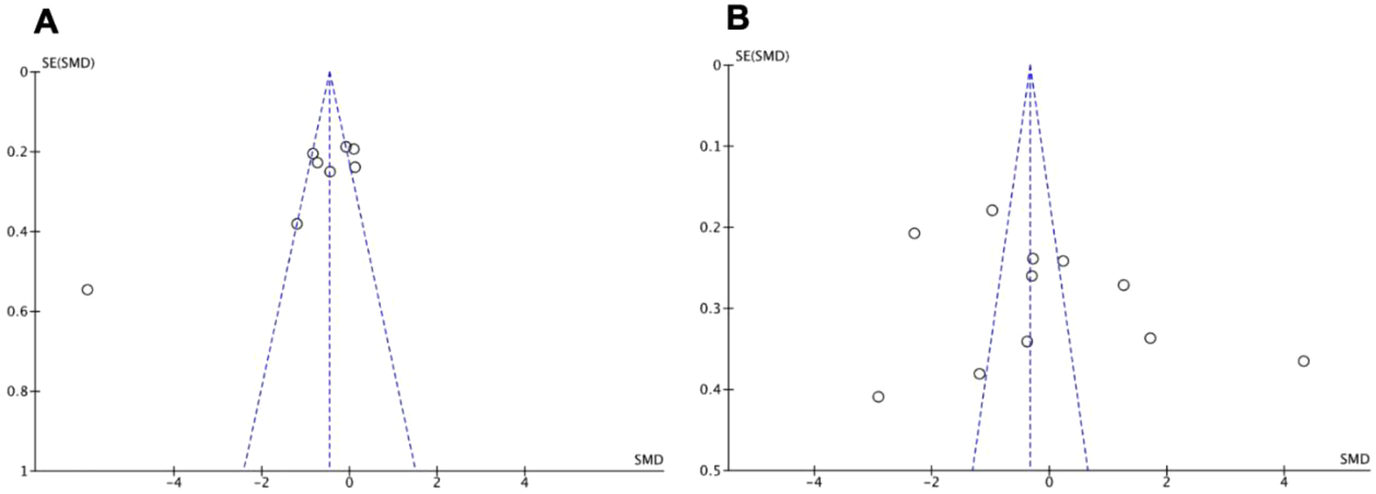 Funnel charts for studies included in meta-analysis for (A) IGF-1 and (B) VEGF are shown.