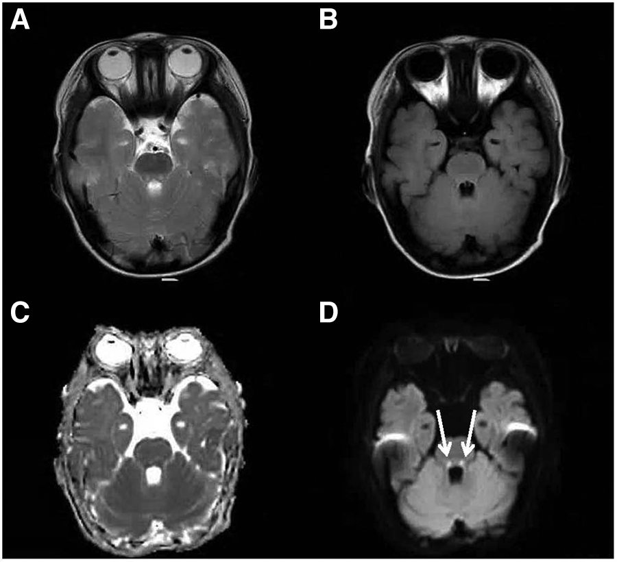 Cranial MRI at the level of the midbrain. An axial T2-weighted (A), an axial FLAIR (B), a dADC (C) and a DWI (D) scans are shown and abnormally high signals in DWI in the midbrain can be seen (white arrow).