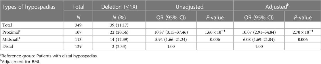Hypospadias is one of genitourinary (GU) tract anomalies, characterized by abnormal urethral development during embryonic development, resulting in the opening of the urethra being located anywhere along the underside of the penis (1). Its prevalence is approximately 20.9 per 10,000 births and has been increasing over time (2). Based on the abnormal location of urethral meatus, hypospadias is classified into distal, midshaft and proximal types (1). It may occur as an isolated disorder or accompany with other malformations (1, 3). Genetic factors have been demonstrated to play a principal role in the etiology of hypospadias, accounting for 77% of the heritability (4). Despite monogenic and chromosomal causes of hypospadias account for about 30% of all cases, the majority of genetic factors remain unknown (5–7). Previous studies are mainly based on sequencing and genotyping, and research on structural variations in hypospadias is limited (8, 9). Although structural variations are known to contribute to the genetic etiology of birth defects (10), few validated genetic markers have been associated with the risk of hypospadias in the Chinese population (11).