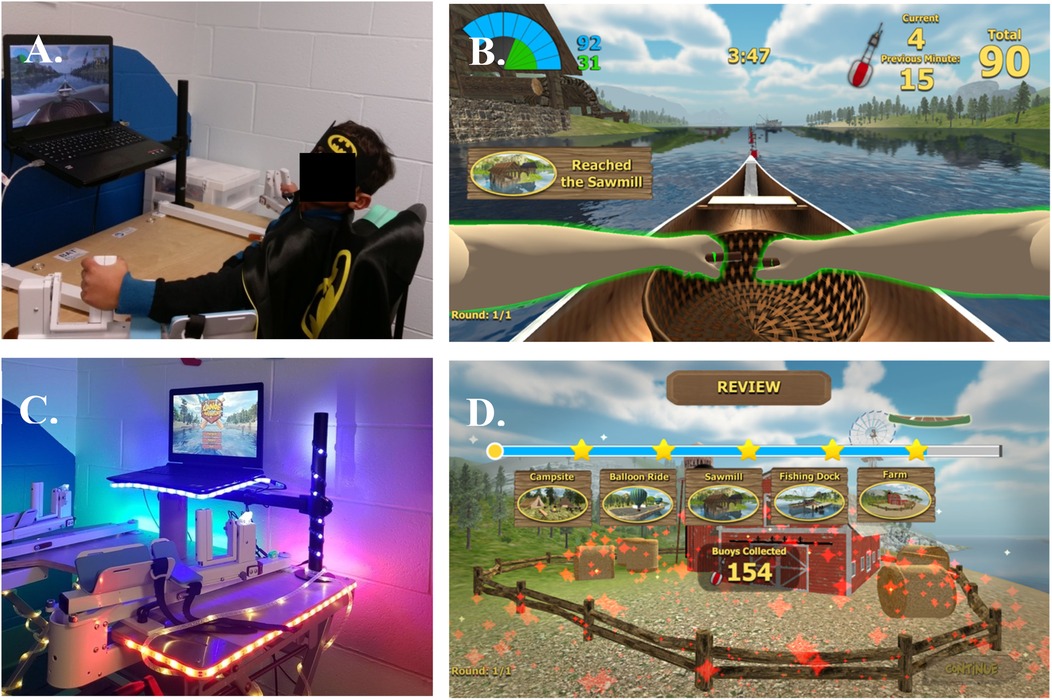 Figure 1. The BAT device. (A) A child demonstrates how to use the BAT. Users grasp the end of oar-like robot arms. (B) Gaming interface. Children played a rowing game, using the affected arm or both arms, by moving the robot arms in a rowing pattern. (C) Early in the study, a child informed US that the device was not a robot, because robots have lights. We added lights to the BAT. (D) The original gaming interface did not provide feedback about how far the user rowed along the river. Children wanted to know more. The device company added landmarks to the game, and added buoys that children would capture by passing the buoy. At the end of each session, children were provided a review of their river journey and a score of how many buoys they collected. This appeared to increase motivation and enjoyment of the intervention.