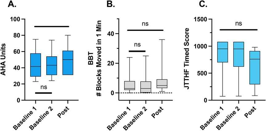 Figure 2. Clinical outcome measures (median, interquartile range, minimum, and maximum shown). There was a significant improvement in the AHA (A) from baseline 1 to post intervention. Tshere were no significant differences between the two baseline assessments. There were no significant changes in the BBT (B) or JTTHF across all time points (C).