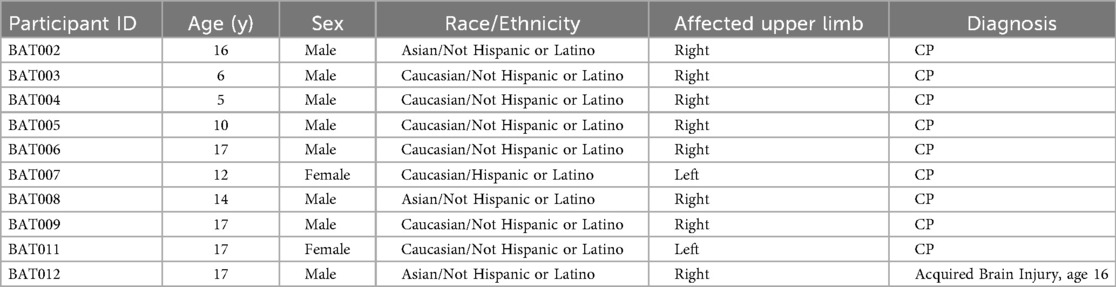 Eight children with hemiparesis completed the intervention. The study was then halted by the COVID-19 pandemic. Table 1 contains demographic information for all participants.