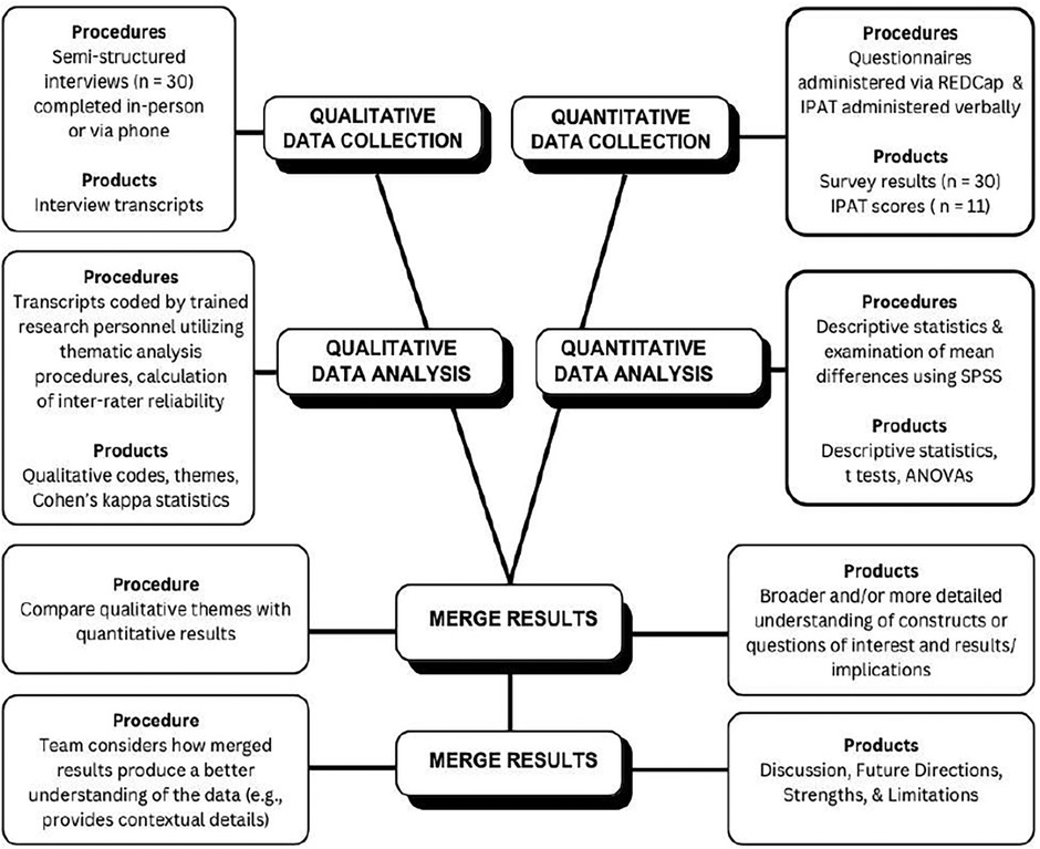 The third aim integrated qualitative (Aim 1) and quantitative (Aim 2) findings according to a convergent design and integration through connecting and merging approaches (35). As the present study involved quantitative measures and qualitative interviews were conducted concurrently, connecting occurred through sampling (i.e., participants completed both procedures) and the convergent study design. This process involved comparing two sets of data to draw a more complete conceptual picture, determine how results inform or expand upon each other, describe different aspects of the research question, and visually integrate data utilizing a mixed methods matrix (20, 36).
