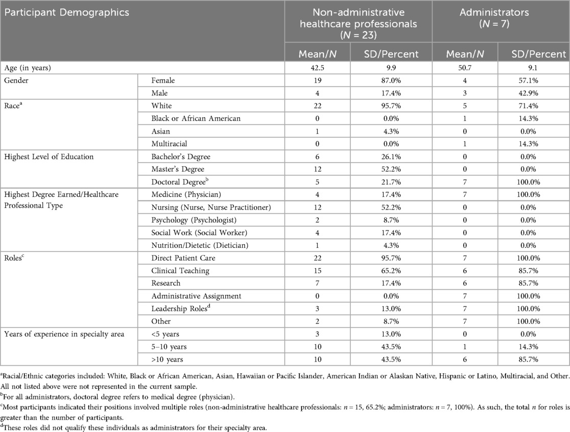 Participants were 30–62 years of age, with an average age of 42.5 years (SD = 9.9) for non-administrative health professionals and 50.7 years (SD = 9.1) for administrators. Most participants had 5 or more years of experience in their specialty area (n = 20, 86.9% of non-administrative healthcare professionals; n = 7, 100.0% of administrators). Most non-administrative healthcare professionals were female (n = 19, 87.0%) and White (n = 22, 95.7%). Most had an advanced degree (n = 17; 73.9%) and were trained in nursing (n = 12, 52.2%), medicine (n = 4, 17.4%), or social work (n = 4, 17.4%). Most administrators were also female (n = 4, 57.1%) and White (n = 5, 71.4%). All (n = 7, 100%) held an advanced (doctoral) degree in medicine. Additional details, including roles held on the clinical team, are described in Table 1.