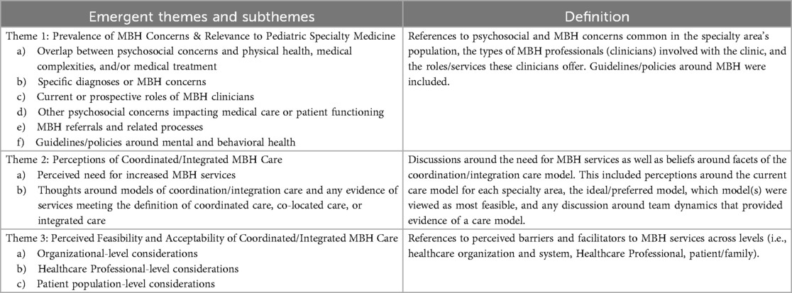 The first aim examined perceptions regarding the role and feasibility of implementing MBH care in pediatric specialty care settings. The four trained coders followed an iterative thematic analytic process involving five stages (30–34). First, coders became familiarized with the data via independent review without a priori hypotheses. Each coder then compiled an initial list of codes, or patterns of conversation, among interviews. During the second stage, coders collectively discussed independently generated codes, allowing for codes to be grouped together, refined, and solidified into a condensed number of codes. This process employed both deductive and inductive coding methods and incorporated reliability checks to create a finalized codebook (Stage 3). Specifically, some codes pulled from the data were influenced by questions included in the semi-structured interview (deductive) and others emerged as new, related topics were brought by participants and observed during independent reviews and team discussions (an inductive process). The fourth stage involved a second independent review using the codebook, with the addition of a new coder not involved with the first round of review for reliability purposes. A similar discussion post-review occurred as well as calculation of inter-rater reliability during the fifth and sixth levels of analysis. These stages allowed for further refinement of the codebook, resolving discrepancy to 100 percent consensus, and establishing a finalized coding frame including thematic clusters or categories of codes and intersections/relations among codes (i.e., creation of sub-themes).