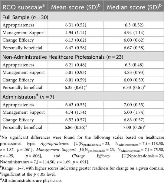 Non-parametric independent samples tests (i.e., MannWhitney, Kruskal–Wallis) assessed mean differences in RCQ scores based on demographics (Table 3). Significant differences were observed for the Personally Beneficial subscale, such that the scores of administrators (Mdn = 7.00) were higher than those of non-administrative healthcare professionals (Mdn = 6.33), U(Nhealthcare professionals = 23, Nadministrators = 7,) = 123.50, z = 2.21, p = .033. No significant differences were found for other subscales (i.e., Appropriateness, Management Support, Change Efficacy) based on healthcare professional type or other demographic variables (i.e., age, gender, years of experience, education level, area of specialty).