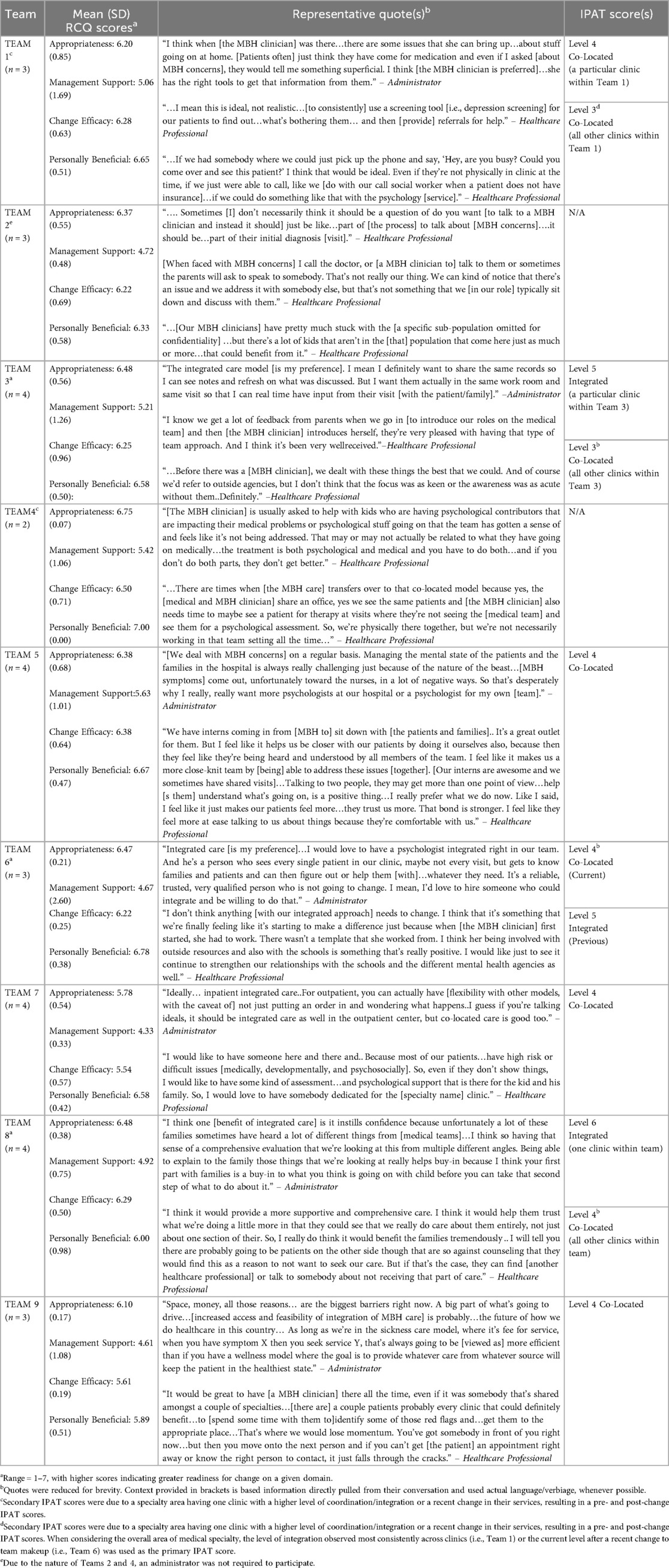Overall, healthcare professionals reported an ardent desire for increased MBH support and collaboration with MBH clinicians in their routine practice regardless of current levels of MBH coordination/integration. Healthcare professionals and administrators described benefits of MBH services across organizational, healthcare professional, and patient/family levels, though recognized important barriers to adoption across the spectrum of care. Consistently, quantitative findings suggested high readiness for change. Qualitatively and quantitatively, teams reported prior experience with MBH services typically at the Co-Located level, as consistent with IPAT scores. Some teams experienced varied access to MBH clinicians over time or across settings, such as varied access based on the day or clinic within a specialty area or changes in funding for this role over time (i.e., a grant-funded position). While only clinic within a team reached the highest level of integrated care, most participants qualitatively described integrated care as the “ideal” model of care.