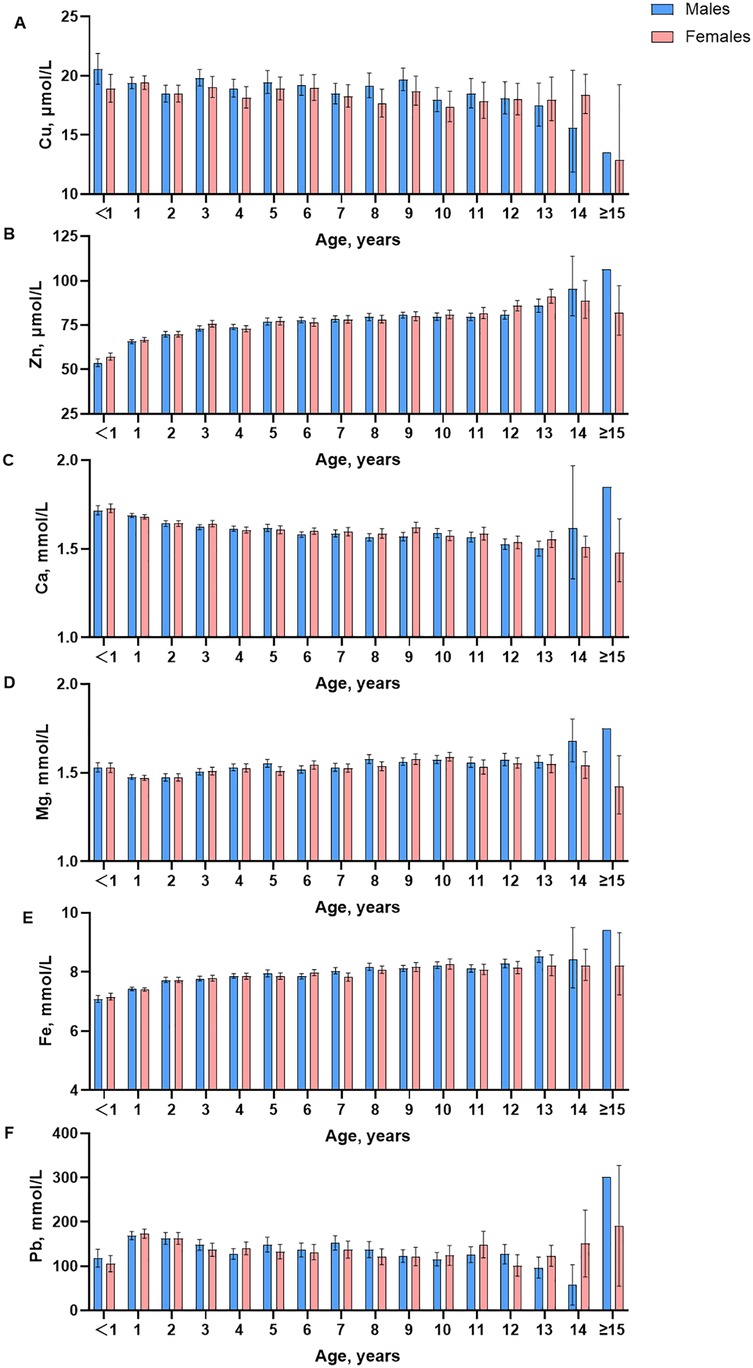 24. Liu J, Yuan E, Zhang Z, Jia L, Yin Z, Meng X, et al. Age-and sex-specific reference intervals for blood copper, zinc, calcium, magnesium, iron, lead, and cadmium in infants and children. Clin Biochem. (2012) 45:416–9. doi: 10.1016/j.clinbiochem.2012.01.014