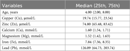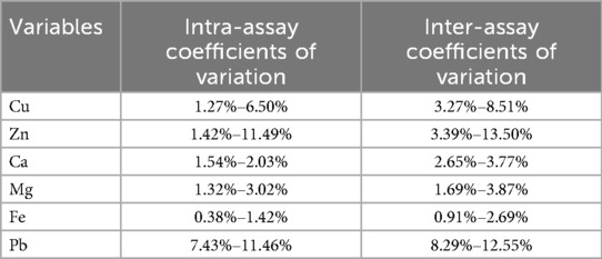We examined the levels of trace elements by analyzing whole blood samples. Throughout the collection and processing of samples, we took every precaution to prevent contamination. Atomic absorption spectrometry was employed to measure the blood concentrations of Cu, Zn, Ca, Mg, Fe, and Pb. The BOHUI 5100 analyzer was utilized for detecting concentrations of Cu, Zn, Ca, Fe, and Mg, whereas the BOHUI 2100 analyzer was used specifically for Pb detection. Relevant reagents and calibration standards were sourced from Bohui Innovation Technology Co., Ltd (Beijing, China). Blood Pb concentrations were traceable to the national reference materials for Pb (GBW08619). Blood Cu, Zn, Ca, Mg, and Fe concentrations were traceable to the following national reference materials: GBW08615 (Cu), GBW08620 (Zn), GBW(E)080118 (Ca), GBW(E)080126 (Mg), and GBW08616 (Fe). Intra-assay and inter-assay coefficients of variation for trace element determination were presented in Table 1.