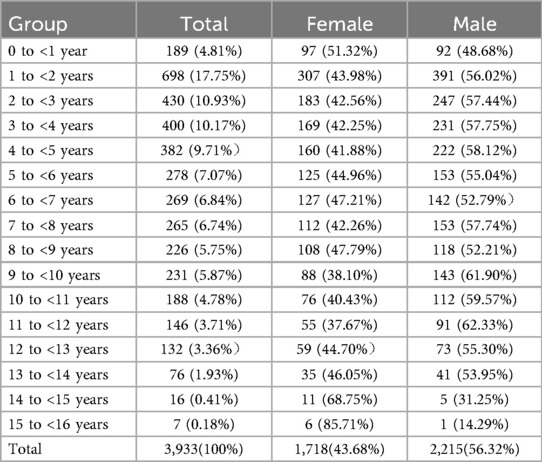 The most critical aspect of establishing RIs is the size of the study population. To determine the 90% confidence intervals for the central 95% RIs, a minimum of 120 participants was necessary (17). Nonetheless, acquiring a sample of healthy infants and children presents significant challenges. Walton's study proposed that hospital-based RIs were the most appropriate for interpretation, as they were measured under conditions that were analogous to those experienced by the majority of patients (18). In total, 3,933 healthy infants and children (2,215 boys and 1,718 girls) were selected from the three health examination centers in Lincang.