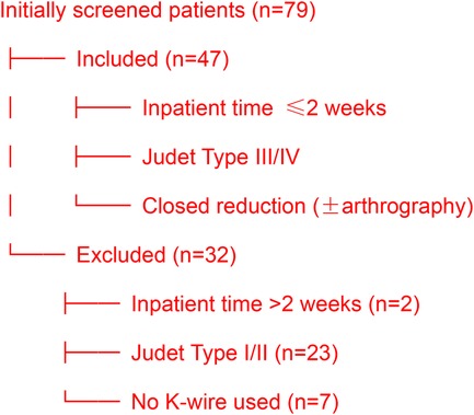 The following patients were excluded from the study: (1) inpatient time from injury more than 2 weeks, (2) with Judet classification Type I or II, (3) closed reduction without Kirschner (Figure 1).