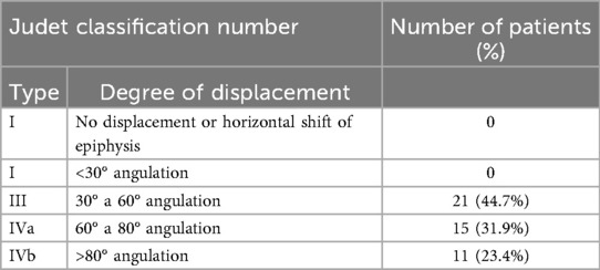 From January 2016 to June 2020, we treated 47 children with angulated radial neck fractures, including 35 boys and 12 girls. The patients’ ages ranged from 2 to 13 years, with an average age of 6 years 9 months. According to Judet classification,21 cases were classified as Type III, 15 cases as Type IVa and 11 cases as Type IVb (Table 1). The radial neck–shaft angle was measured as the angle between the line perpendicular to the articular surface of the radial head and the axis of the radius. Translation was measured as the distance in millimeters measured from the center of the radial head to the axis of the radius. The left side was affected in 29 cases, and the right side was affected in 18 cases. The ulnar olecranon fracture was concomitant in 15 cases. There were no vascular or nerve injuries.