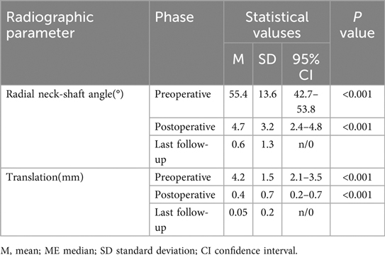 All cases were followed up for an average of 43 months, ranging from 24 months to 90 months. Postoperative reduction was assessed using x-ray within one week after the operation. No loss of reduction during short-term follow-up, and there were no instances of infection or injury to the deep branch of the radial nerve. All the fractures achieved union within 4 weeks after operation. Long-term follow-up revealed no radial head necrosis or synostosis between the proximal ulna and radius. At the end of follow-up, no epiphyseal arrest or valgus deformity of the elbow was observed (Table 2). ICC for angulation and translation was 0.91 (95% CI: 0.86–0.95), indicating excellent agreement.