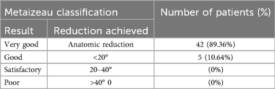 Table 3. Radiological metaizeau classification after surgical treatment, along with the number of patients in groups.