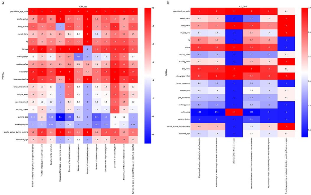 Figure 1 depicts the overall performance of the collected participants in PIOFRA according to International Classification of Diseases 11th version (ICD 11th). The colors indicated the average scoring points ranged from 0 to 2, and each row stands for one testing item. Overall, we noticed that similar performance across different diagnosis that neonates in NICU display suboptimal reflex and sucking behaviors. Our study conducted the t-test analysis to depict the difference between neonates who can or cannot achieve oral feedings, and our results found that neonates achieved oral feedings were scoring significant high points than those who were fed by gastric tube in PIOFRA total scores. Infants who obtained oral feedings scored 39.58 ± 5.51 points while those who cannot achieved 35.79 ± 6.89 (p equals to 0.00).
